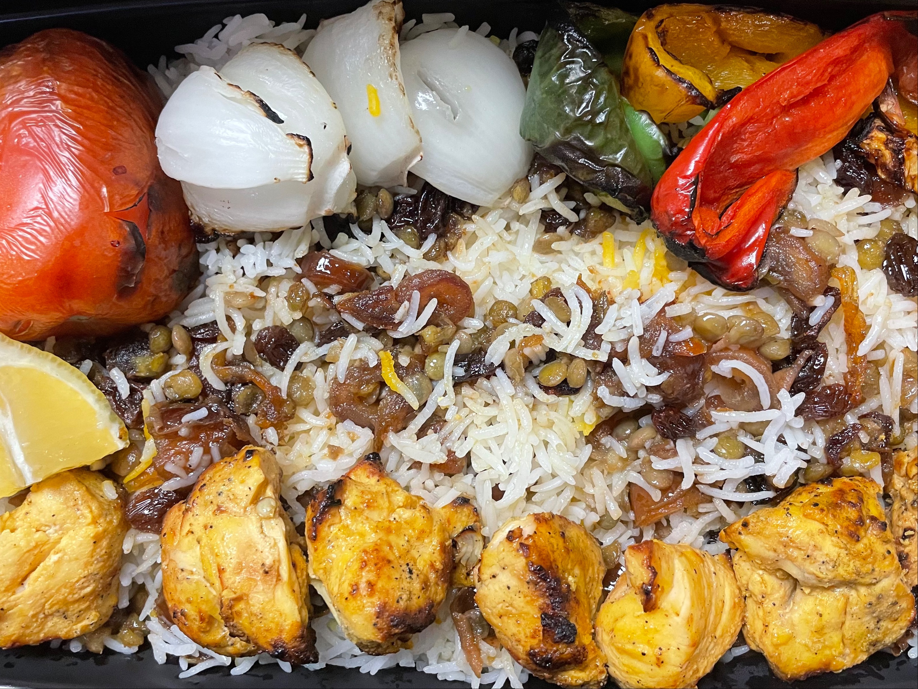 Includes 2 kubideh skewers, rice, and tomato