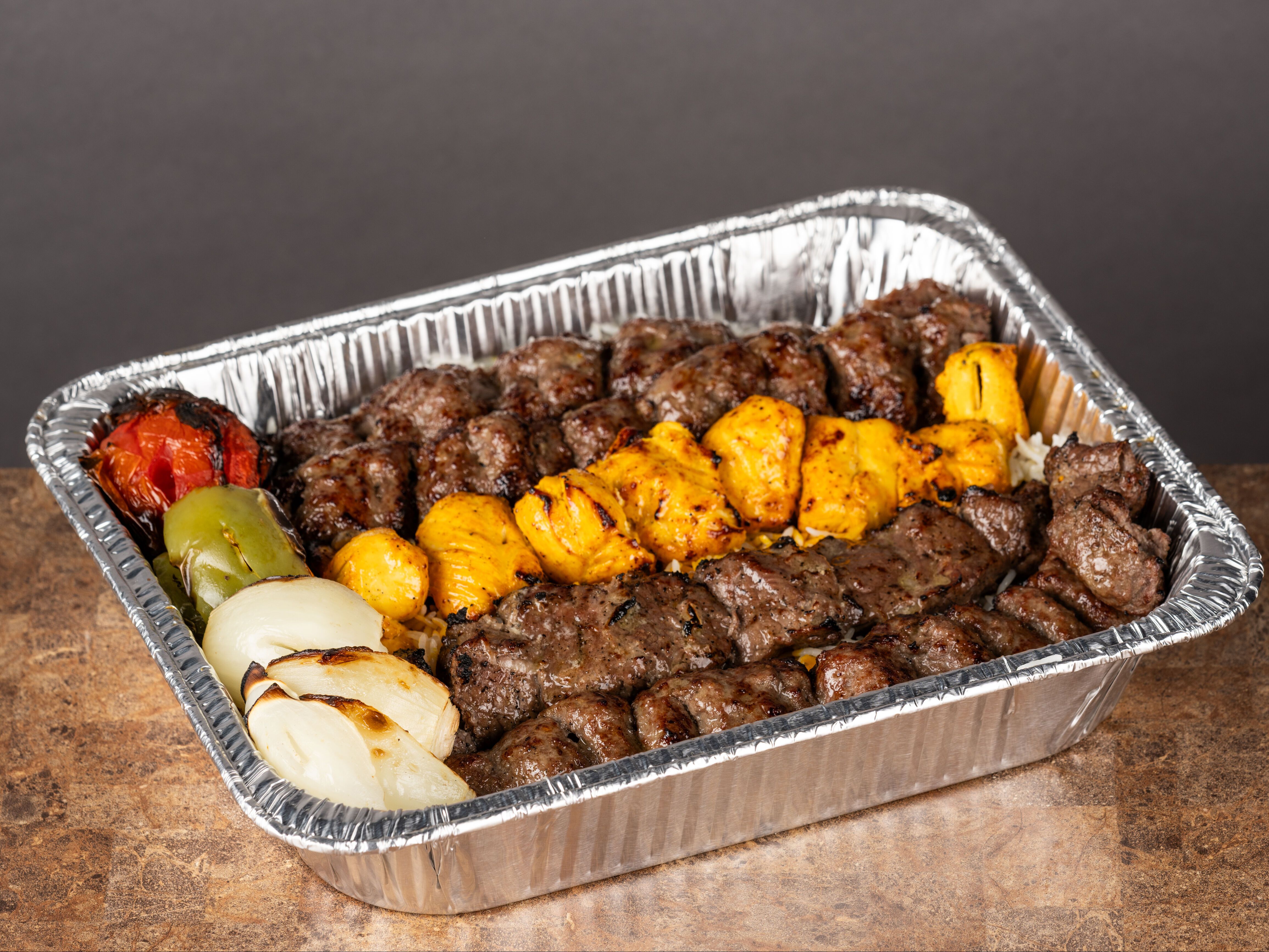 CHICKEN JOOJEH KABOB, BEEF SHISH KABOB, BEEF KUBIDEH, GRILLED VEGGIES/TOMATOES, FATTOUSH SALAD, GARLIC, BREAD, HUMMUS, BASMATI RICE