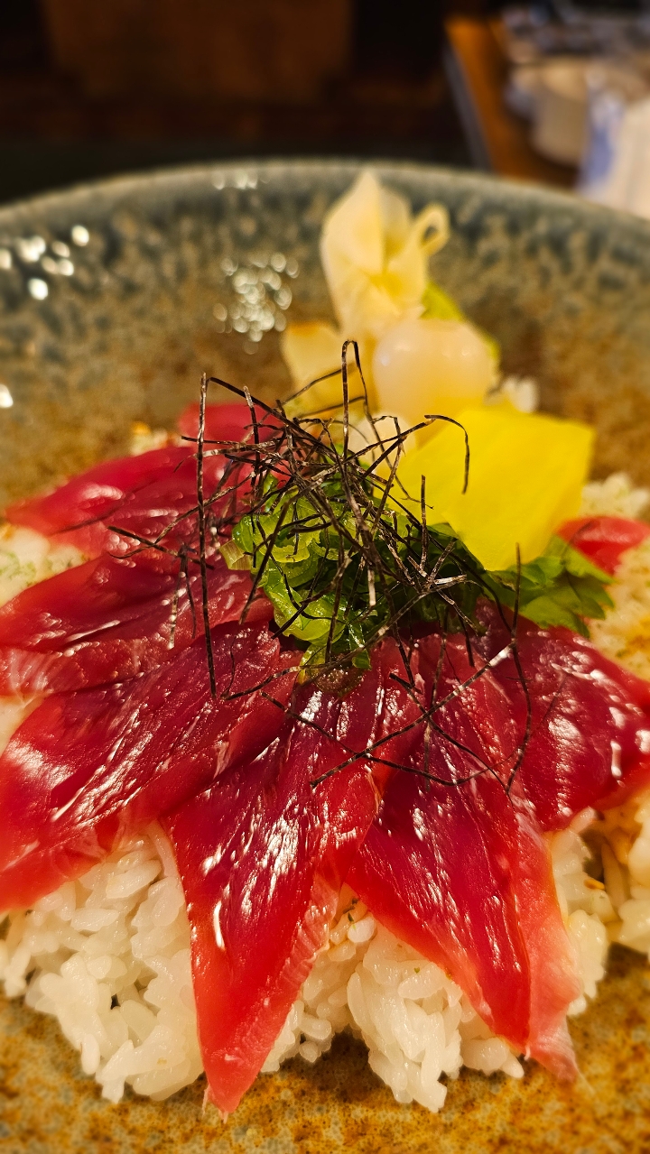 Bluefin tuna sashimi over sushi rice. Contains raw or undercooked ingredients