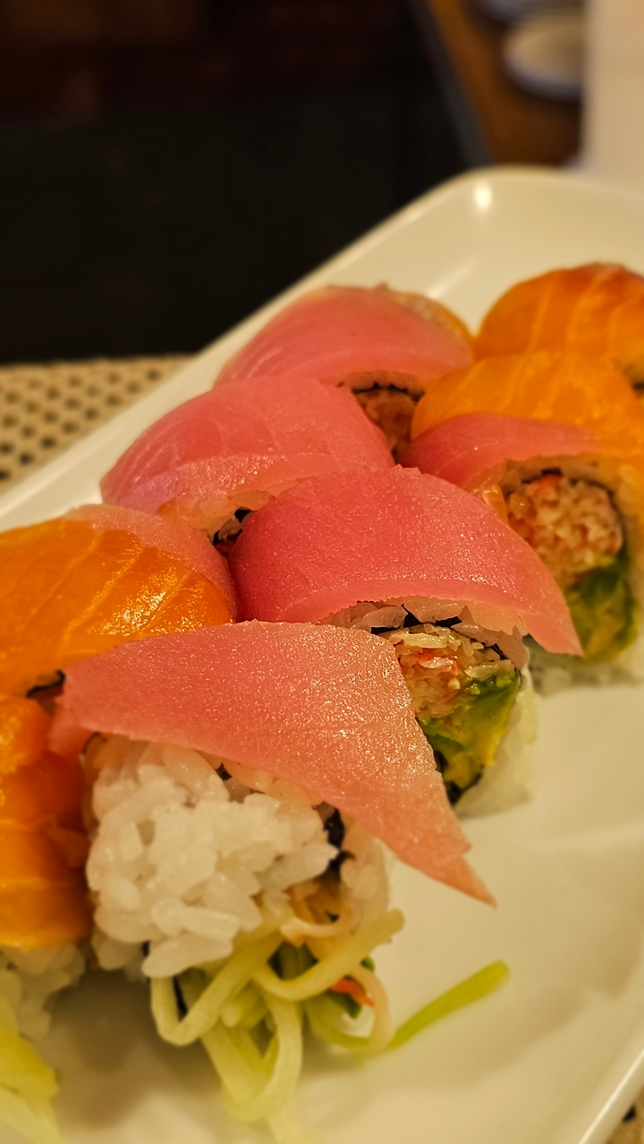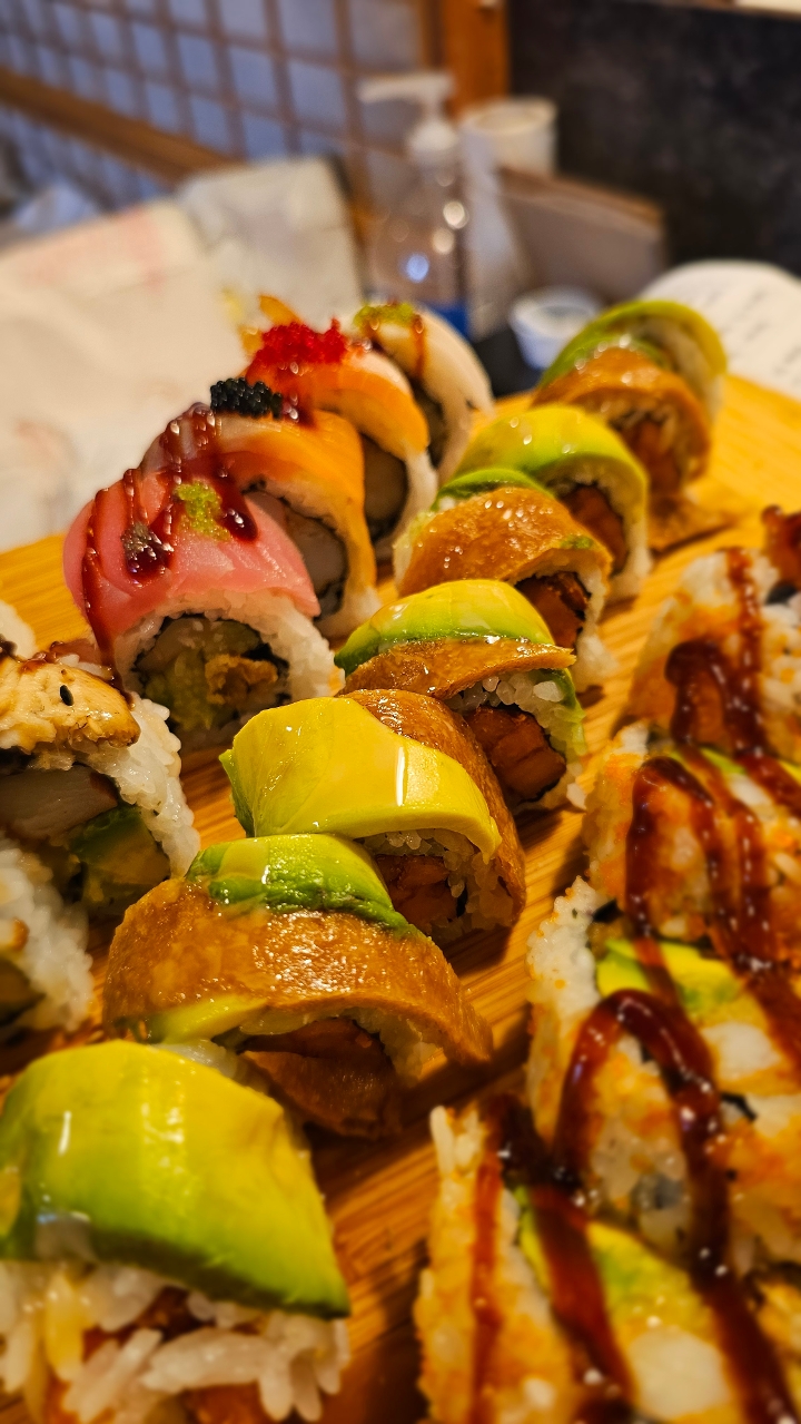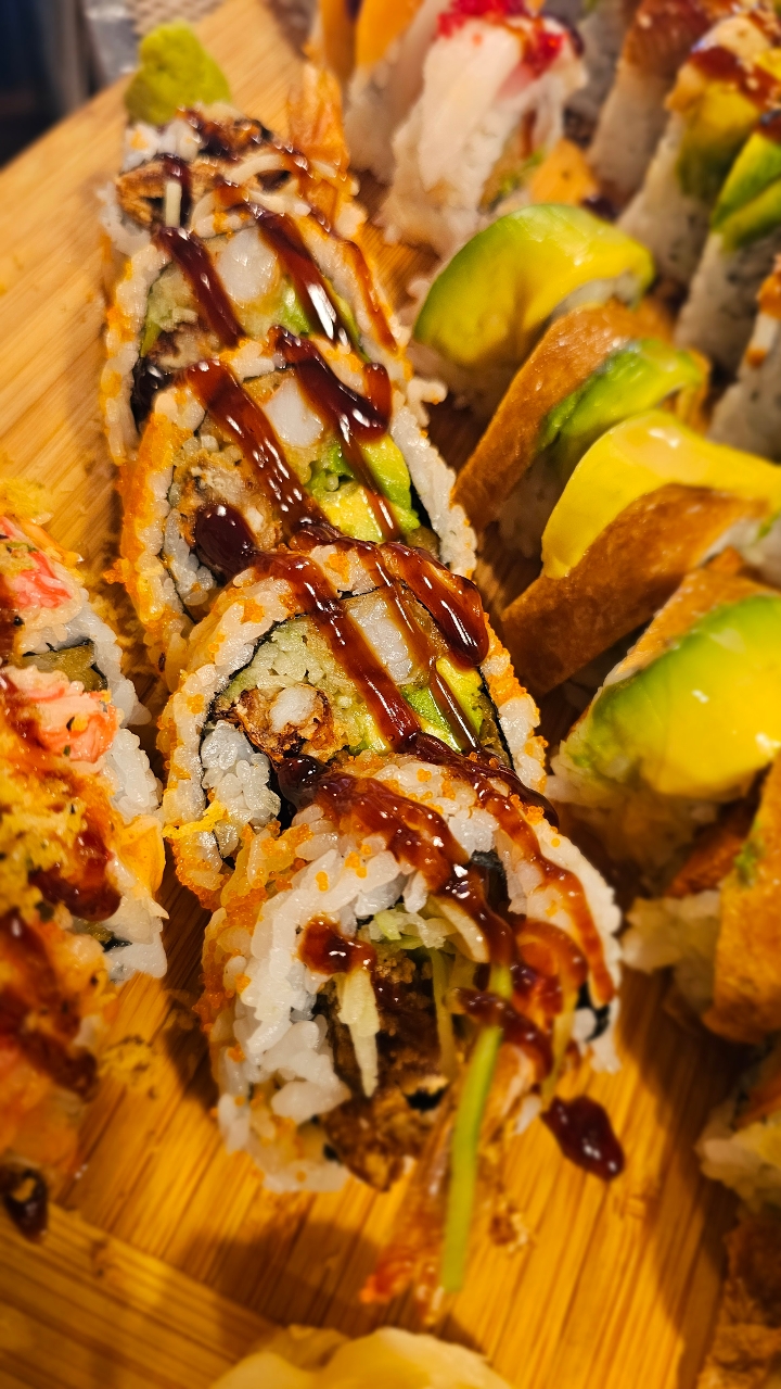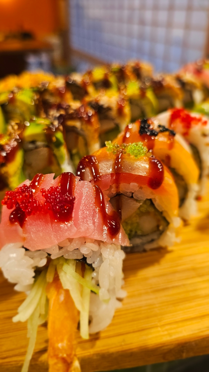 Shrimp tempura, crab, cucumber, avocado topped with tuna, salmon, white tuna, and assorted fish roes. Drizzled with eel sauce. Contains raw or undercooked ingredients
