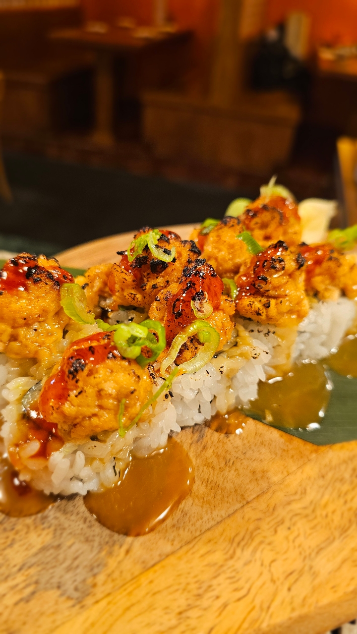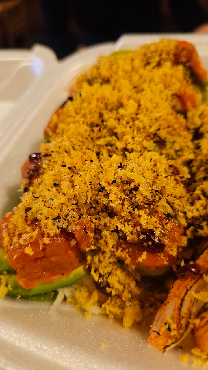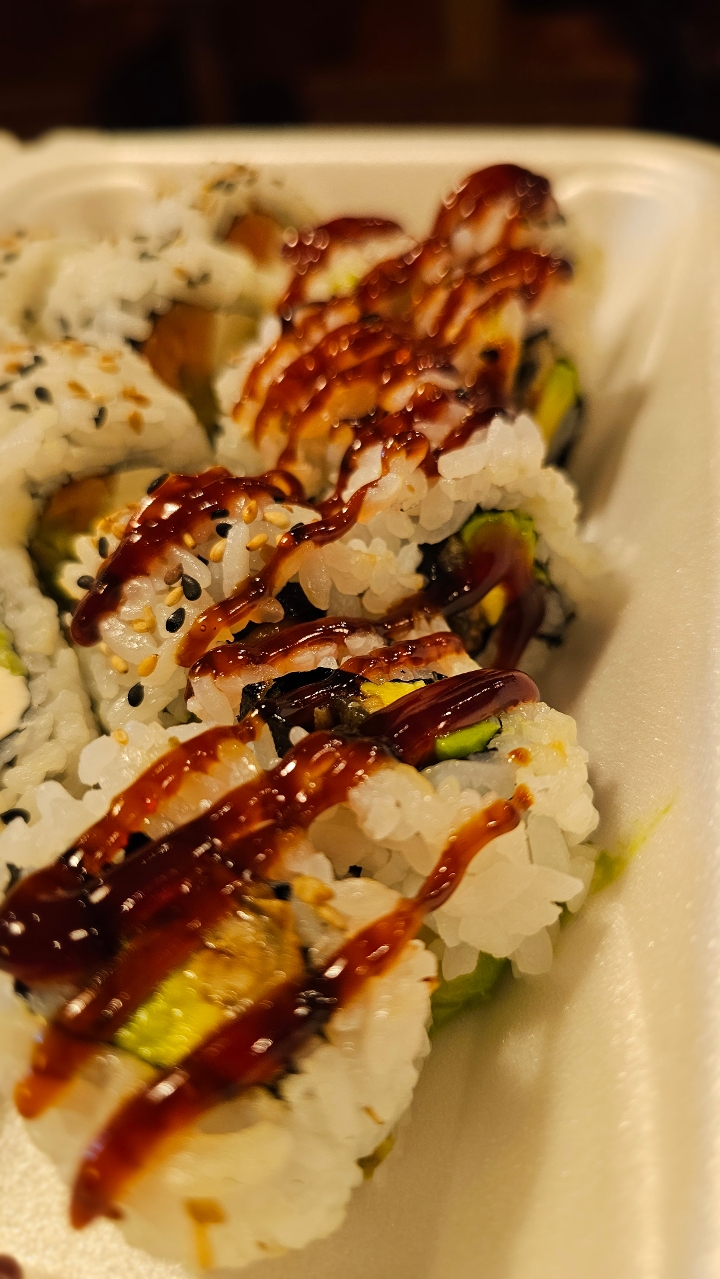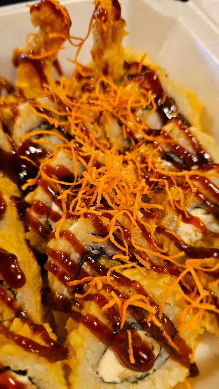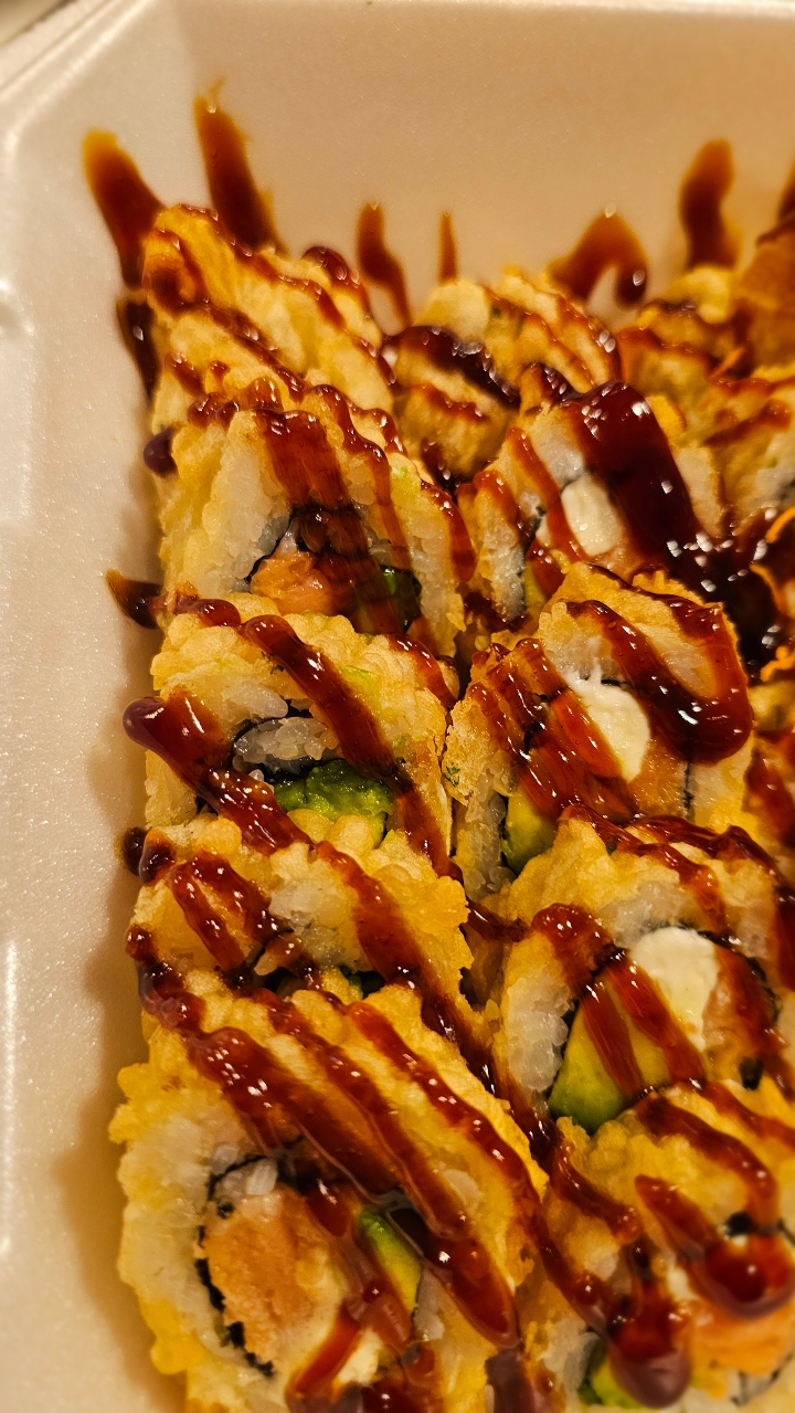 Fried shrimp, avocado, cucumber, and crab stick topped with spicy tuna and bake in the oven. Drizzled with eel sauce