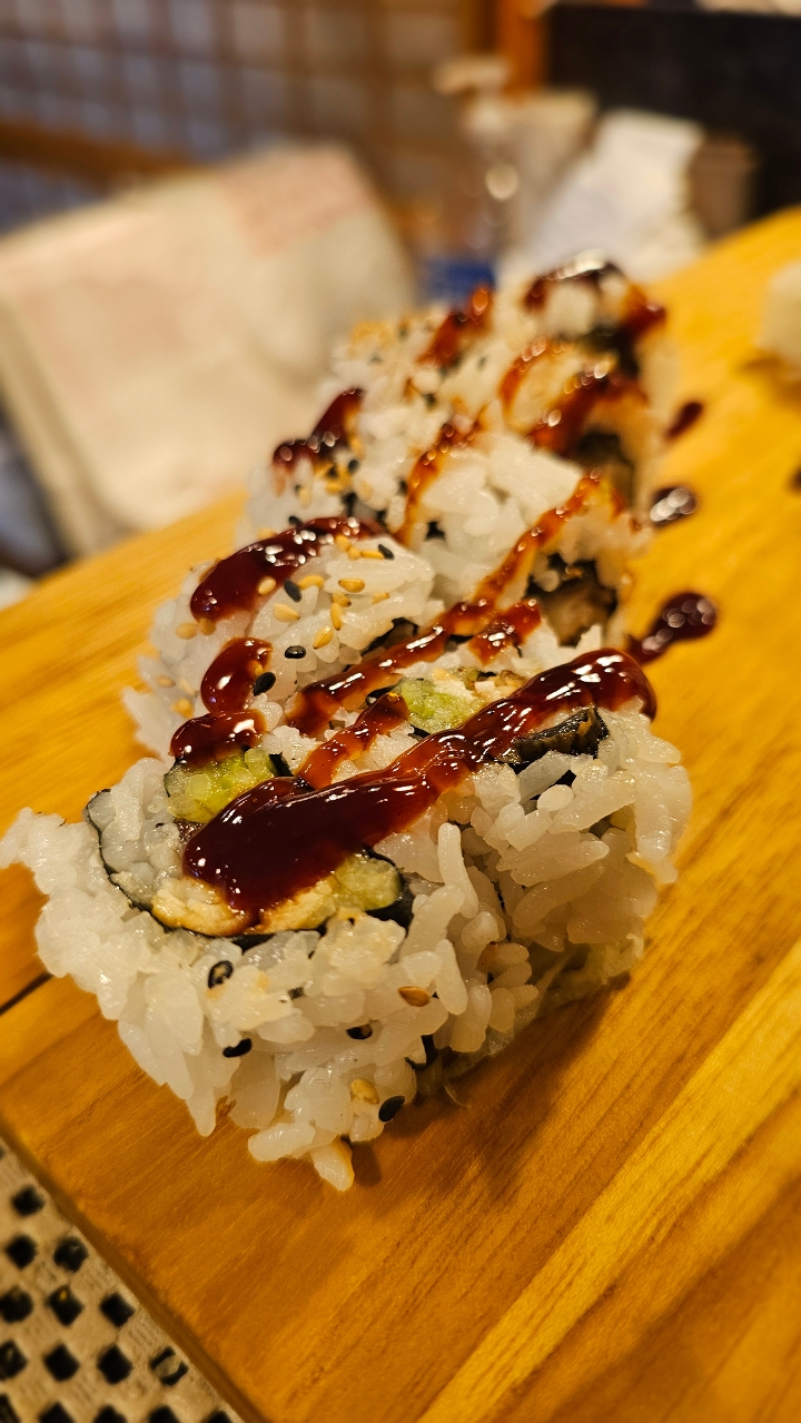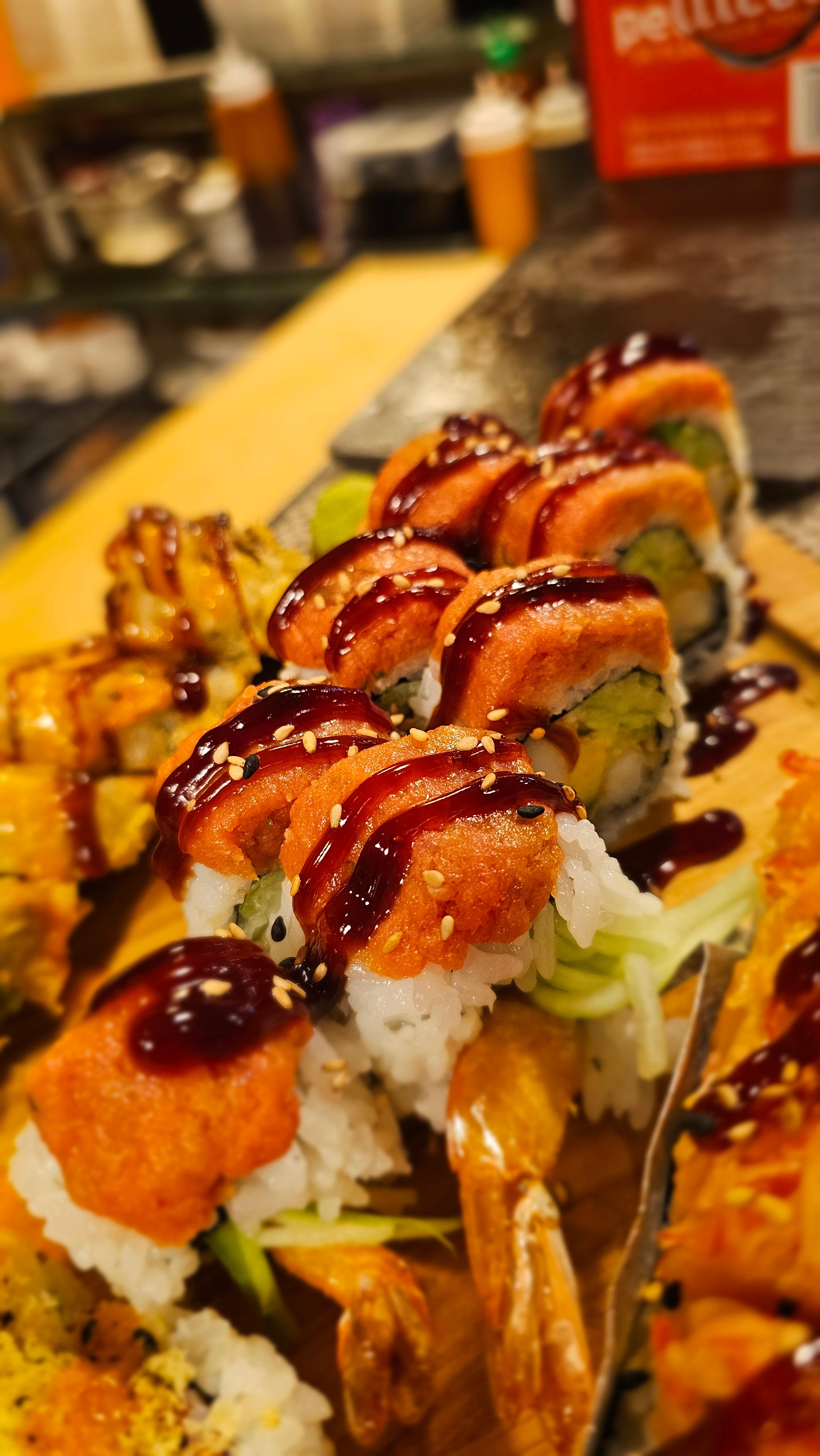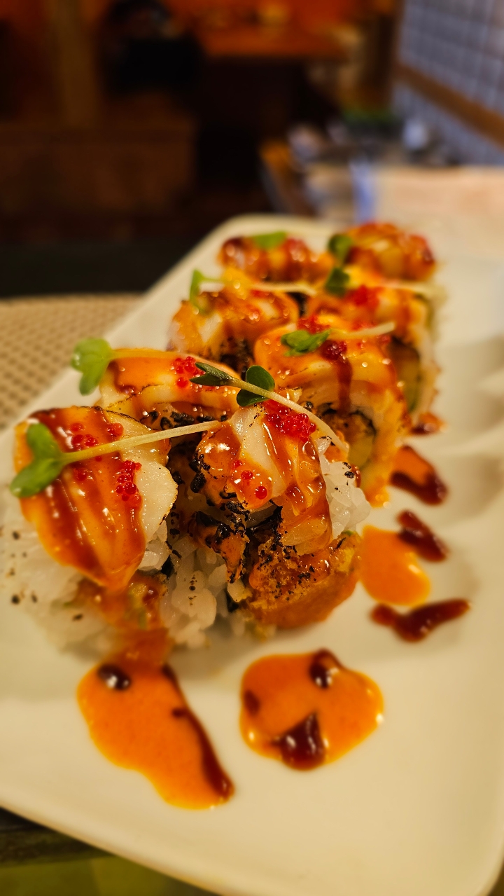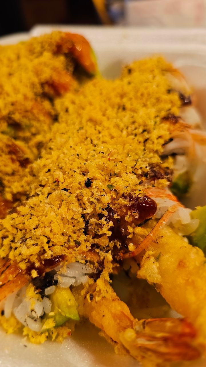 Fried shrimp, avocado, cucumber, and crab stick topped with spicy tuna and bake in the oven. Drizzled with eel sauce