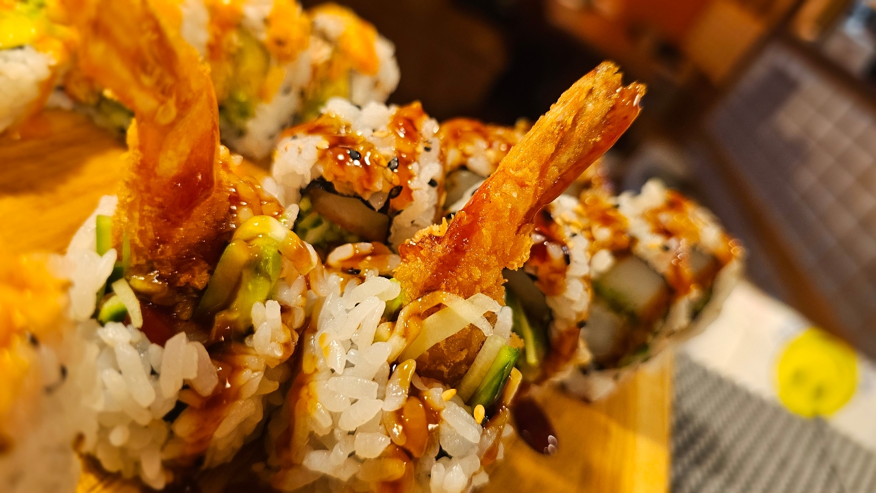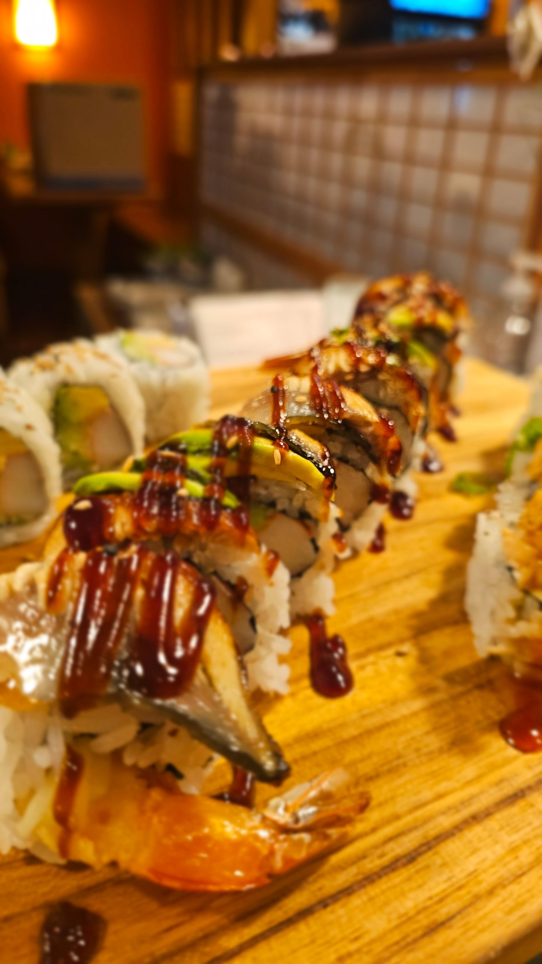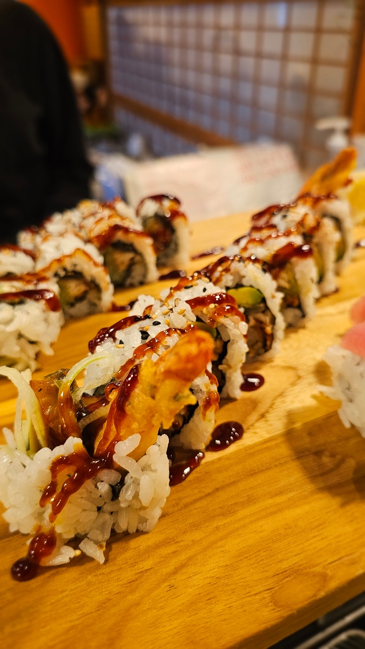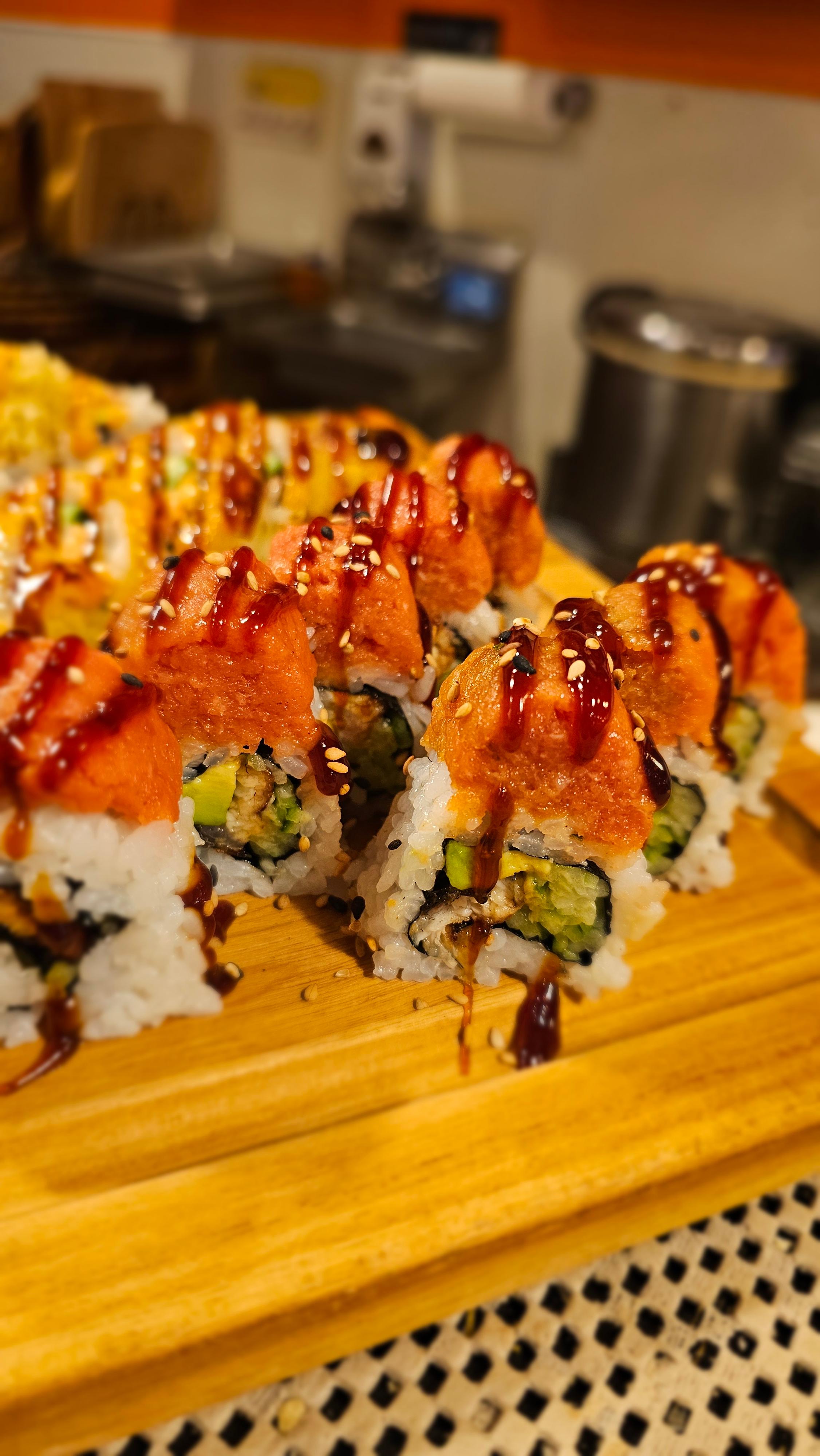 Fried shrimp, avocado, cucumber, and crab stick topped with spicy tuna and bake in the oven. Drizzled with eel sauce