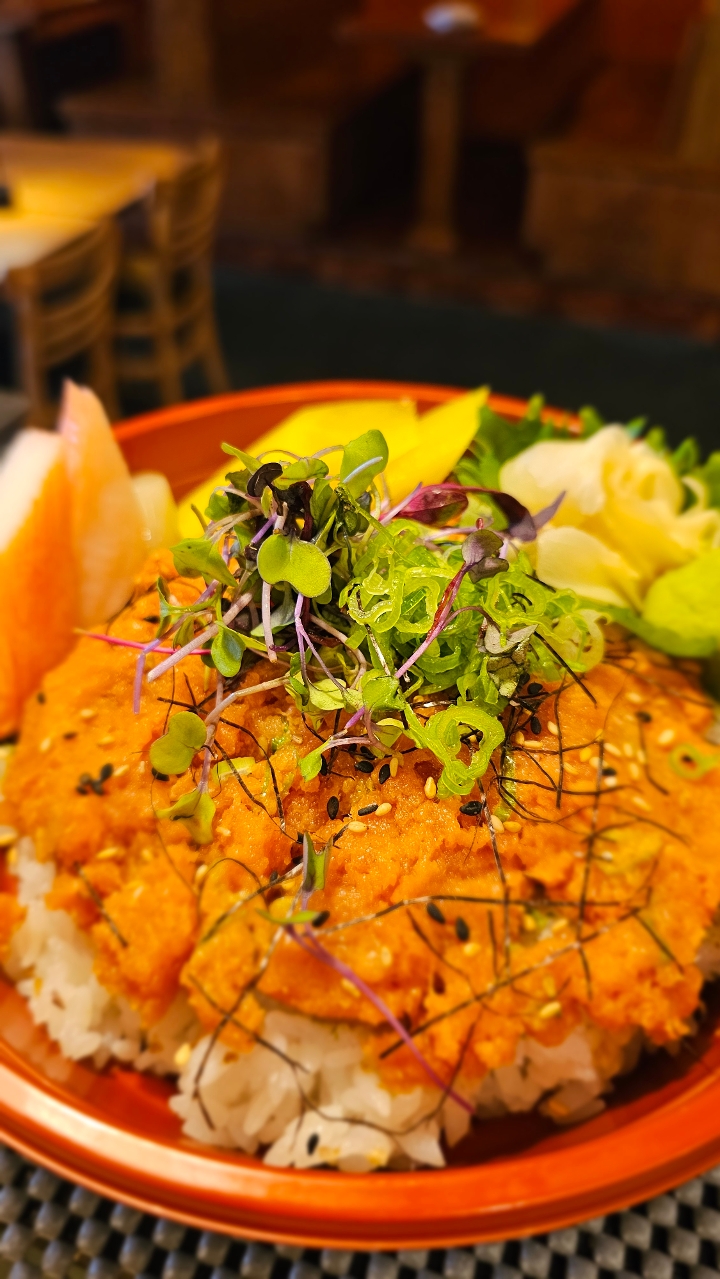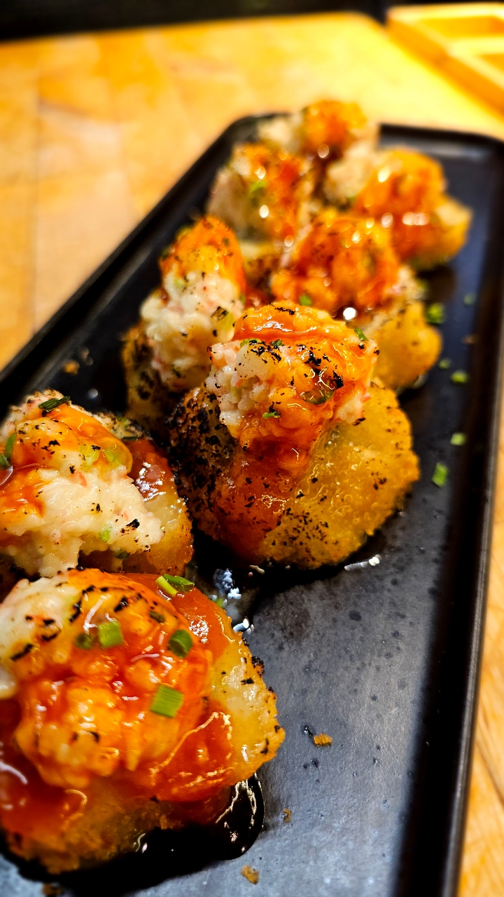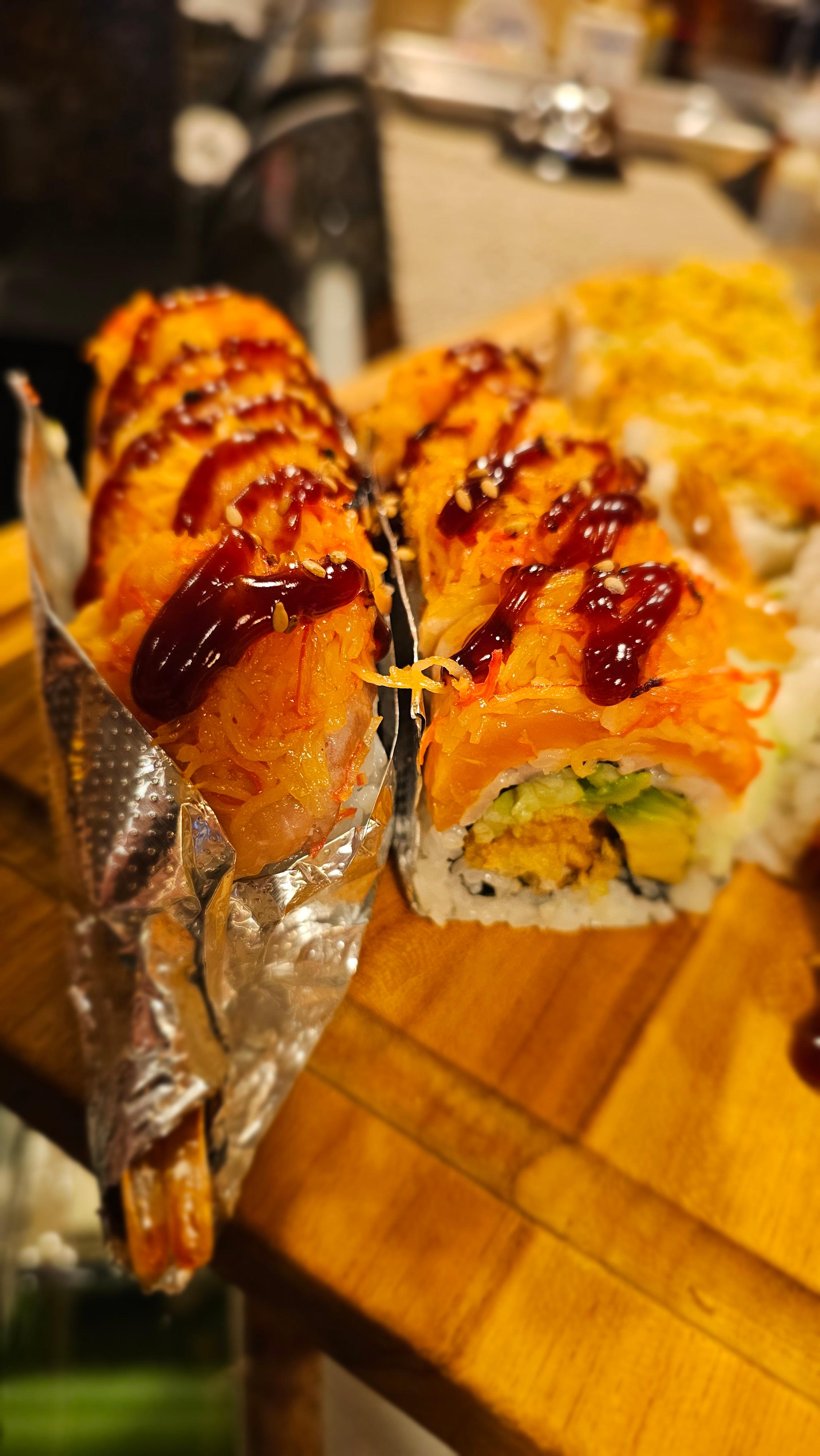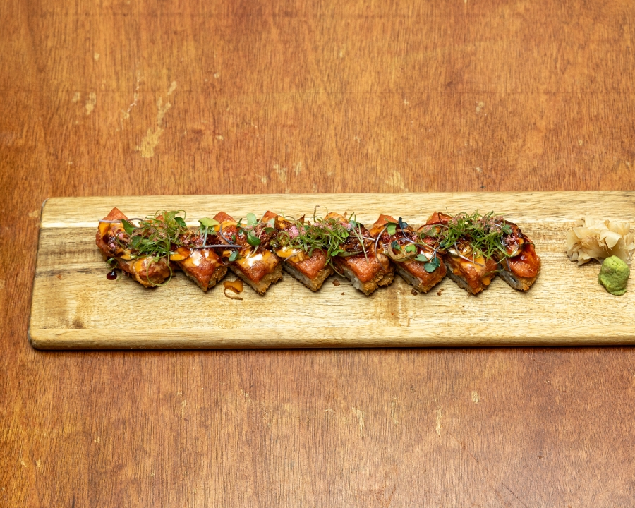 Spicy salmon, crab salad, avocado inside and deep-fried. Drizzled with eel sauce and spicy mayo. Sprinkled with sweet potato crisps