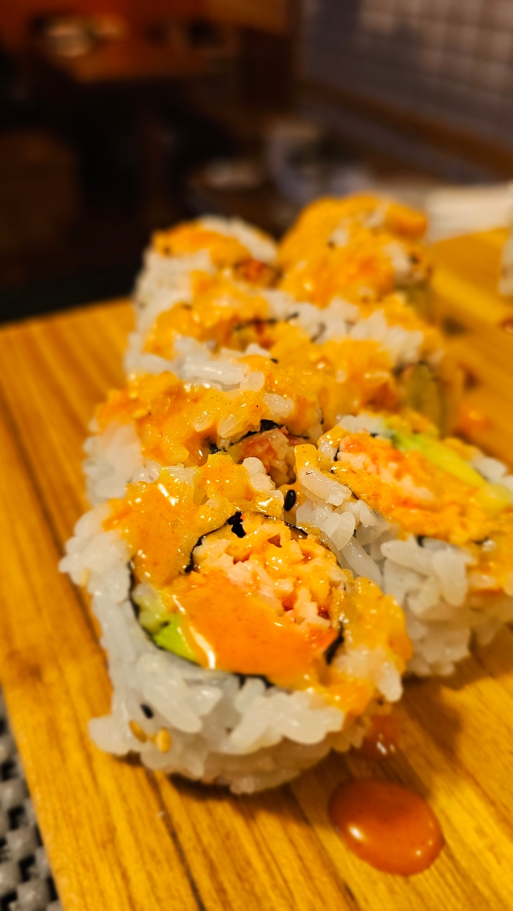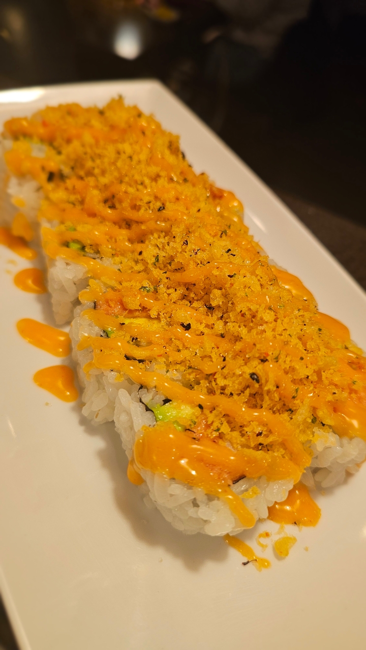 Crab stick, avocado, spicy tuna topped with tempura flake. Drizzled with spicy mayo. Contains raw or undercooked ingredients