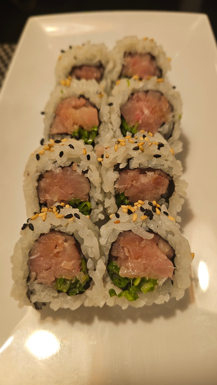 Fresh water eel, cucumber, and avocado topped with spicy tuna. Drizzled with eel sauce. Contains raw or undercooked ingredients