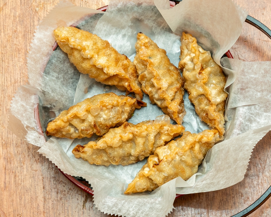 Deep fried kimchi and mixed vegetable dumpling.