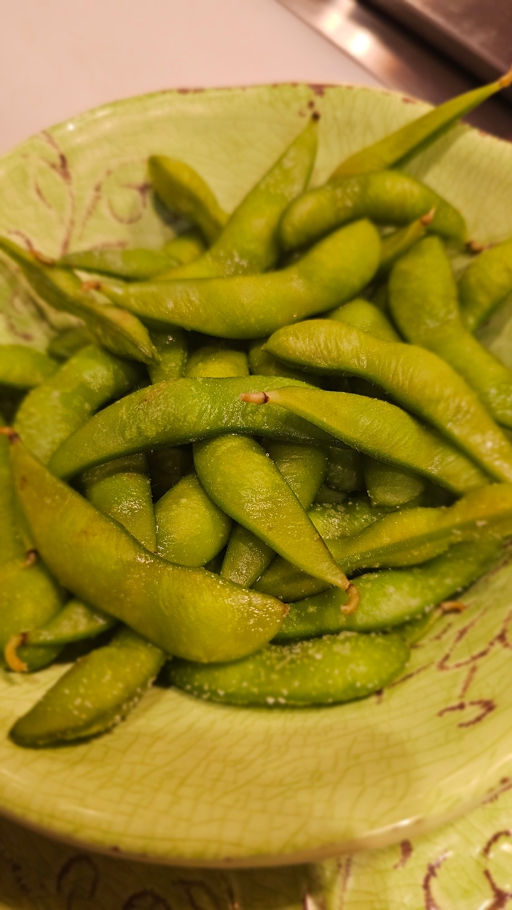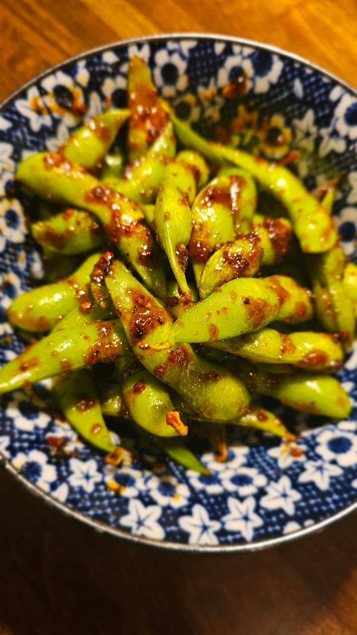 Sauteed broiled edamame with garlic and red pepper.