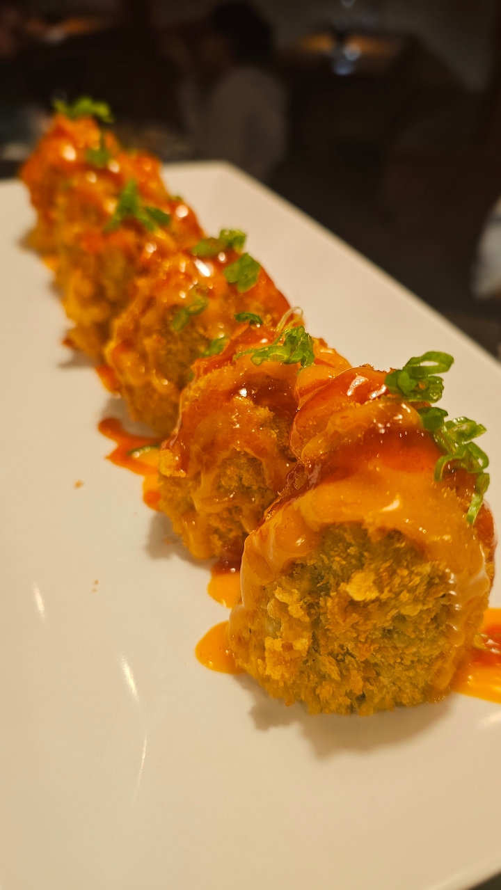 Smoked salmon, cream cheese inside and deep-fried. Topped with jalapeño and dotted with spicy mayo, and sriracha
