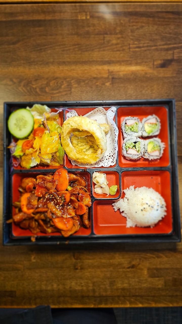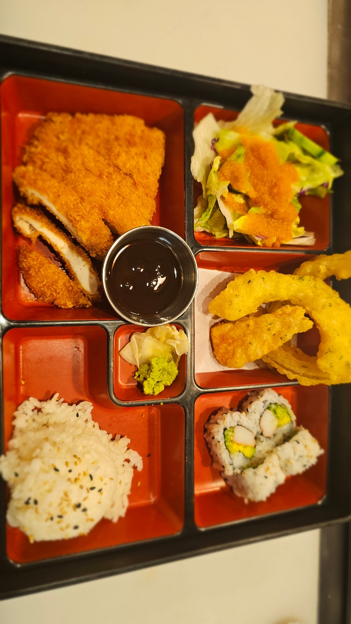 6 pieces of fresh chef selected sashimi, 4 pieces nigiri sushi + California roll. Contains raw or undercooked ingredients