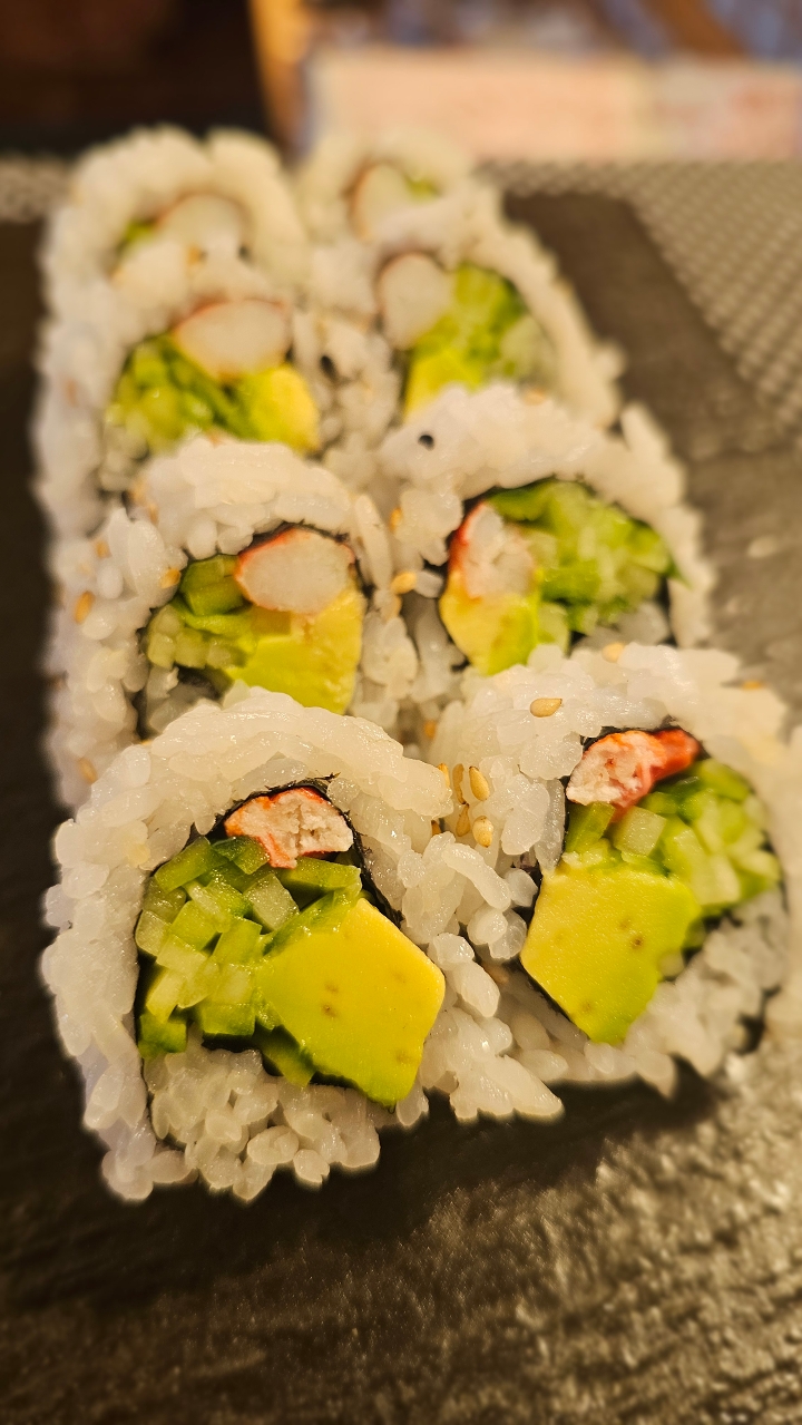 Crab stick, avocado, cucumber, yama gobo, oshinko, kanpyo, and egg cake