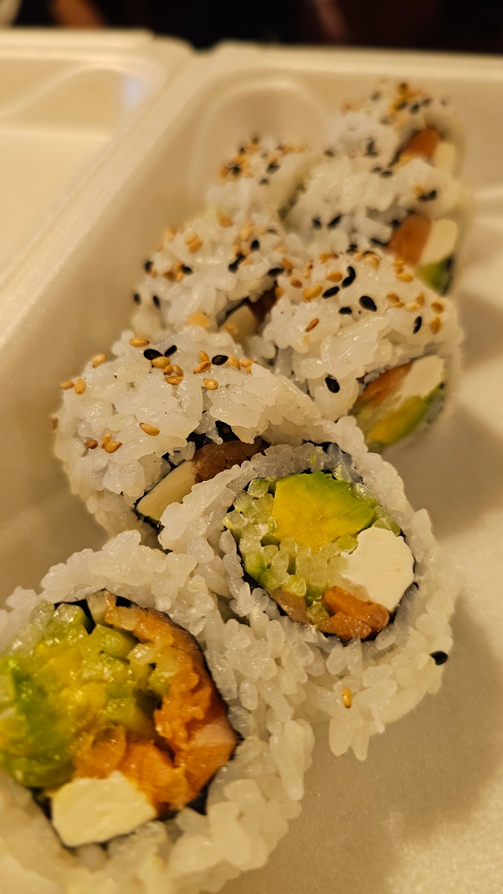Crab stick, avocado, and cucumber topped with spicy crab and salmon mix. Contains raw or undercooked ingredients