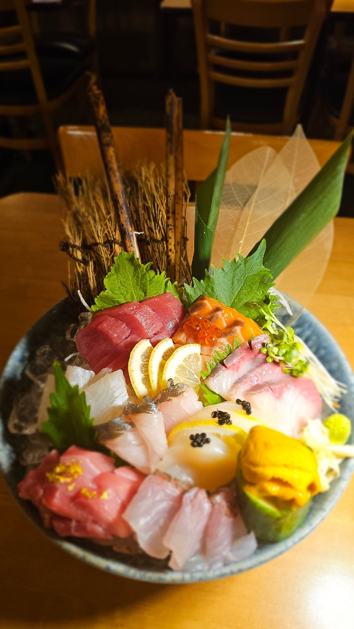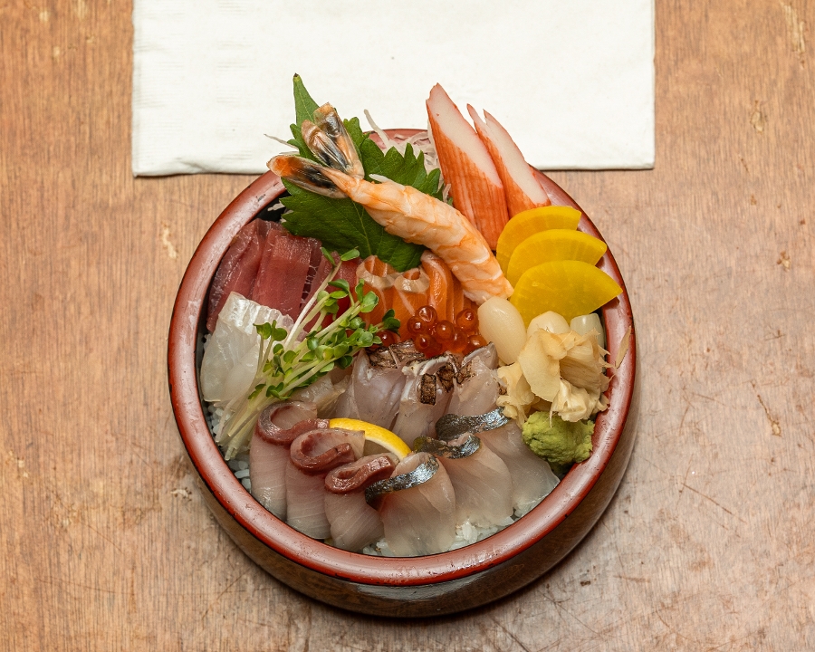 Assorted sashimi over sushi rice. Contains raw or undercooked ingredients