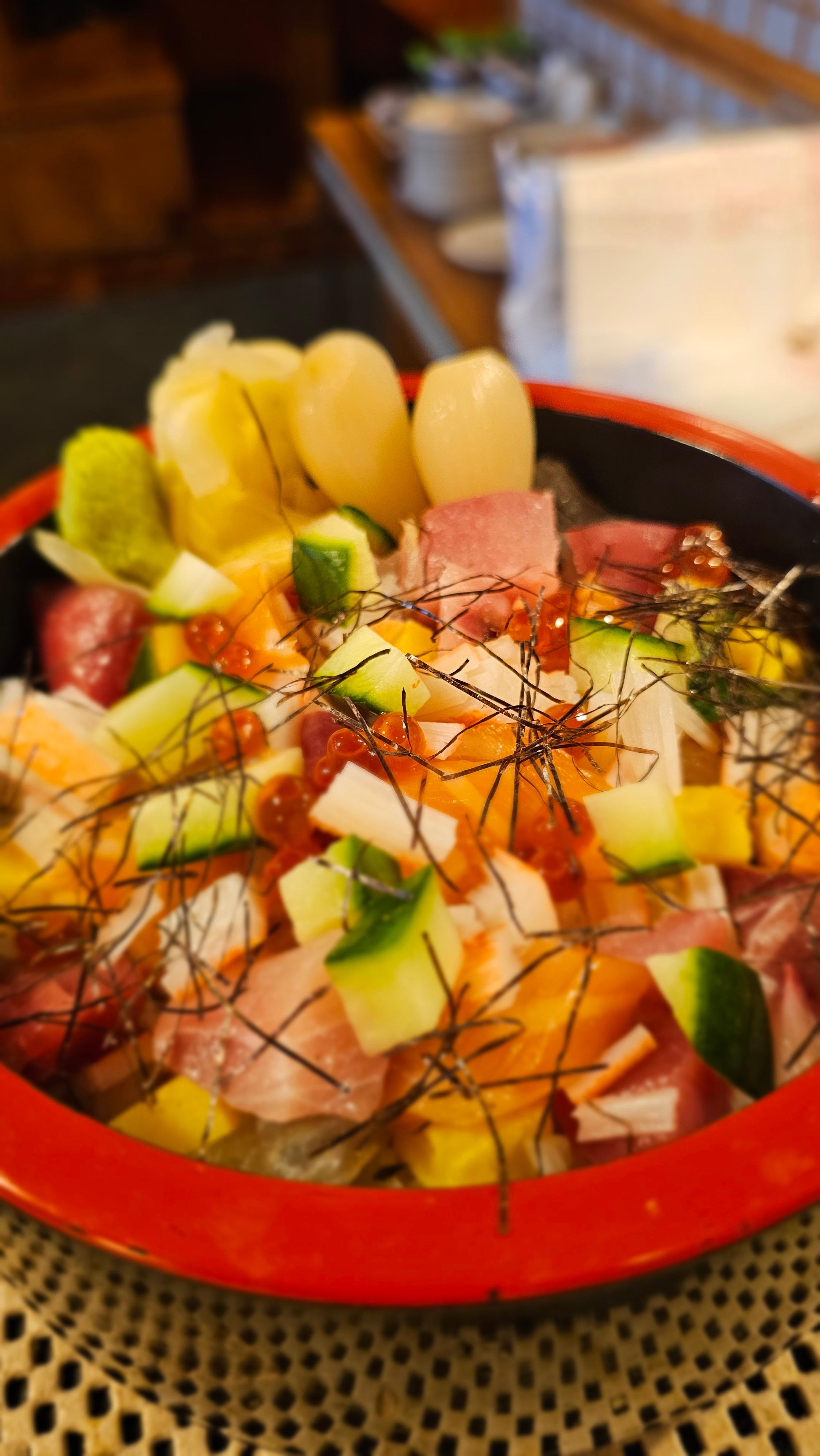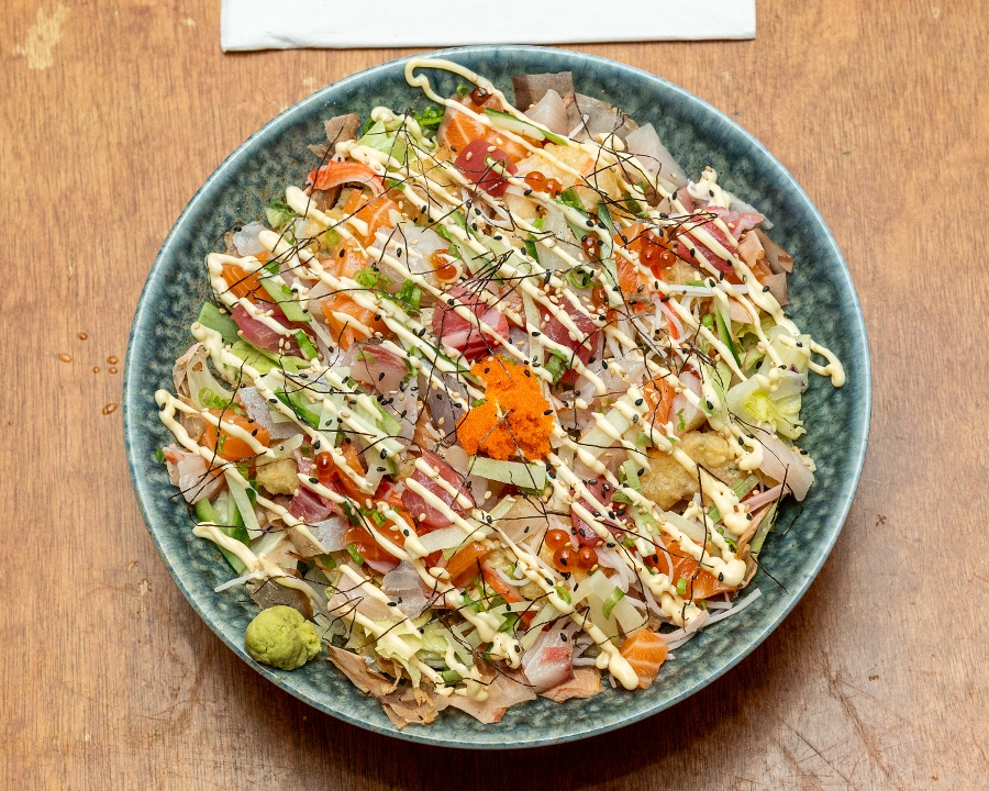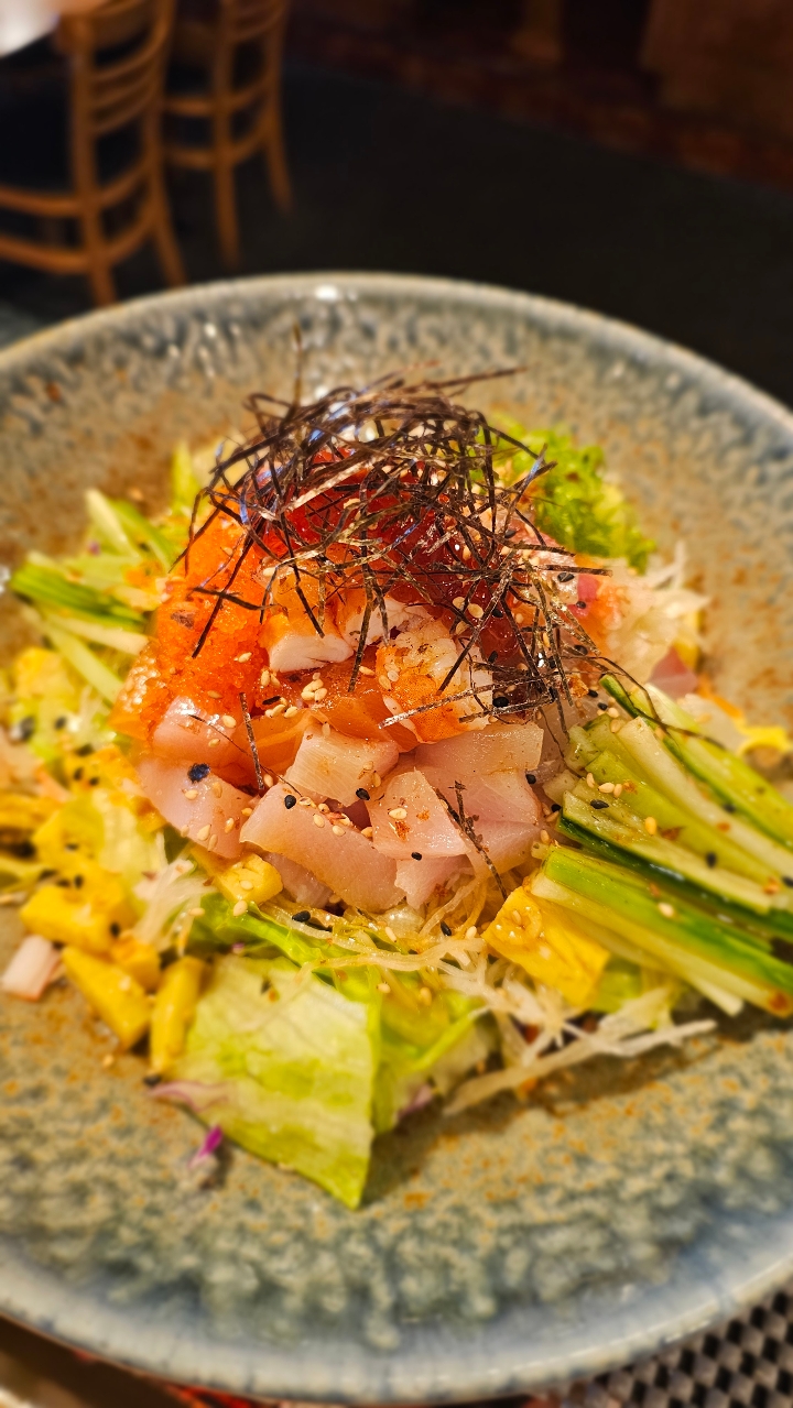 Japanese style cold udon noodle served in sesame dressing with salad, fried shrimp, green onions, katsuo bushi, cucumber, nori and assorted sashimi grade fish. Served with house made miso soup