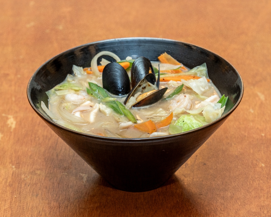 Japanese style seafood noodle with variety of seafoods and vegetables in pork broth.