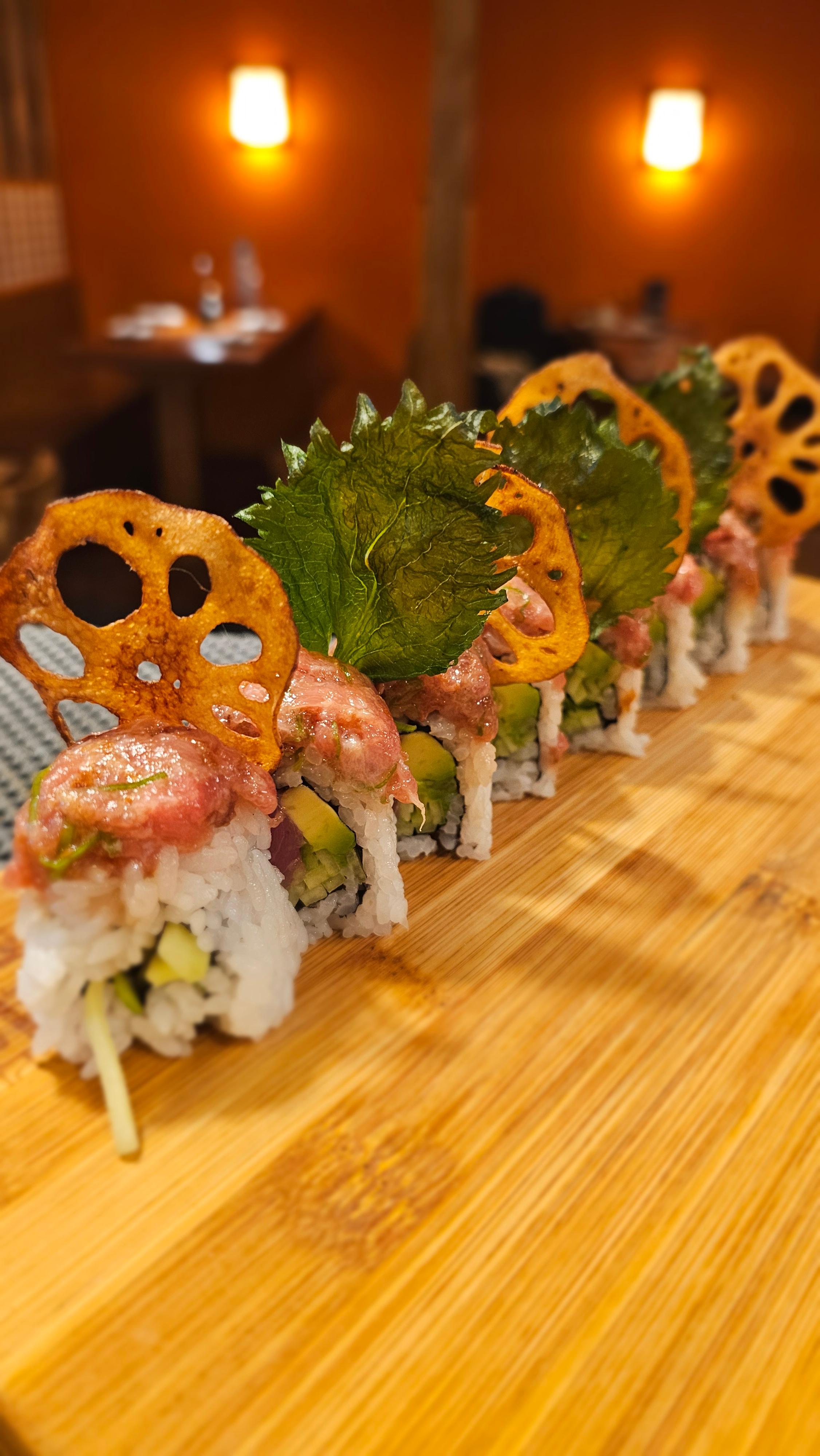Tuna, avocado, cucumber topped with otoro tartare, fried garlic, scallions, fried shallots, ponzu sauce & lotus root chips.