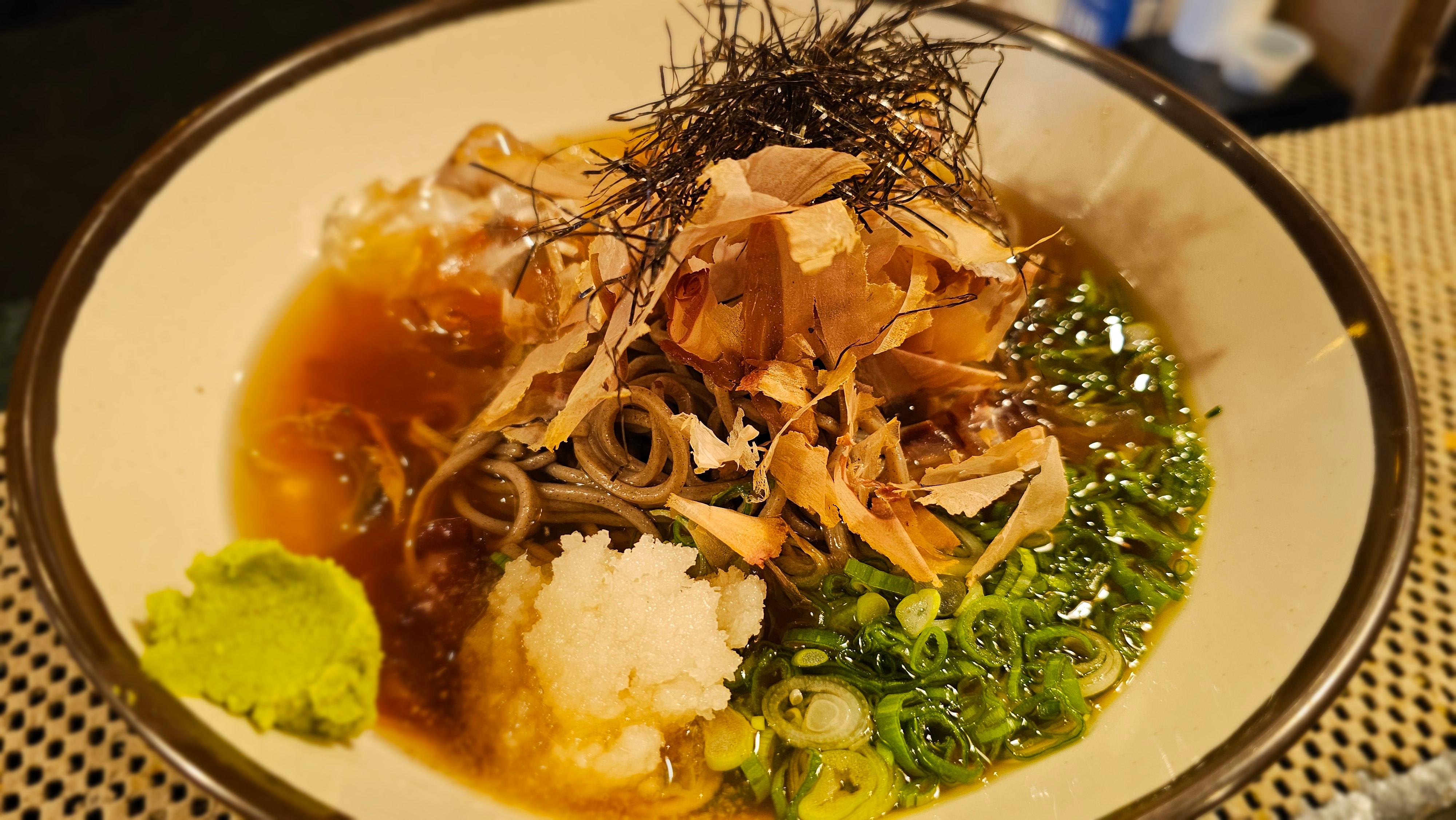 Japanese cold buckwheat noodle served in soy broth.