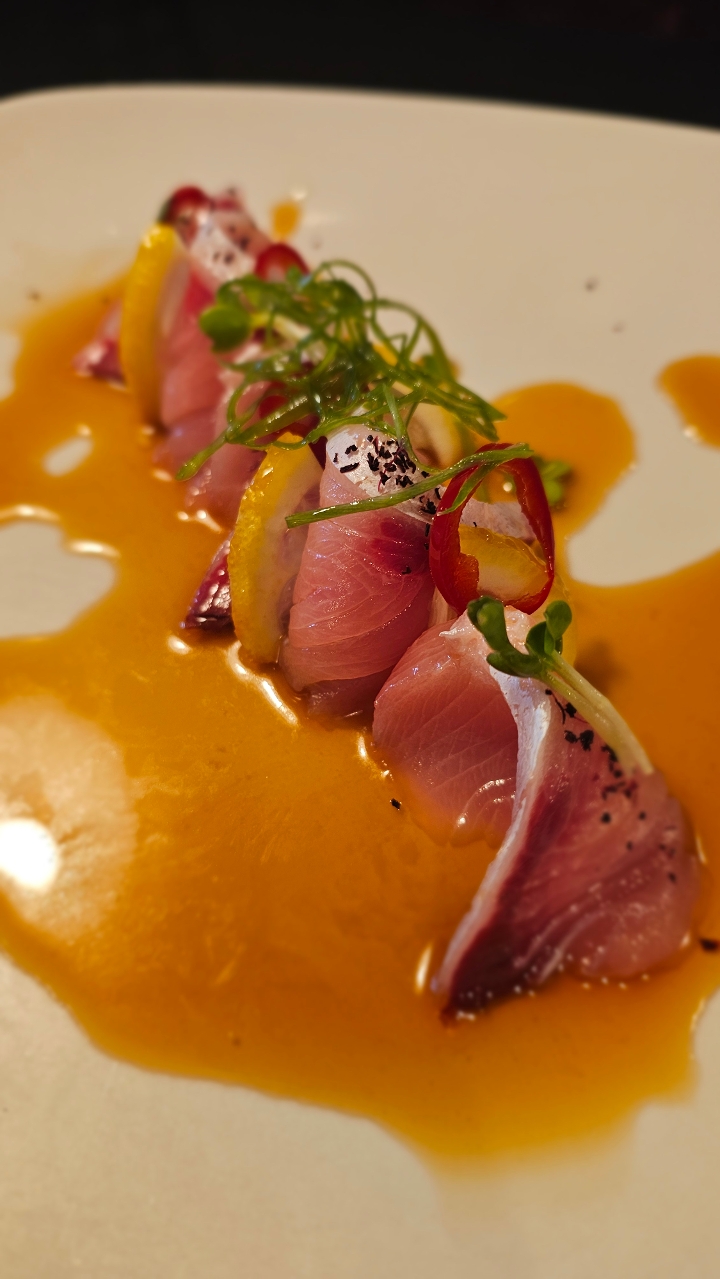 Slices of yellow tail topped with jalapeno, sriracha, ponzu sauce.