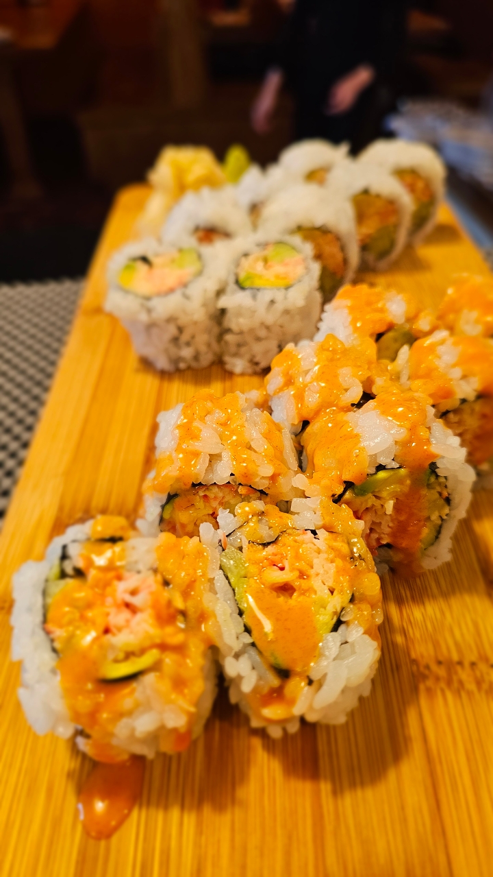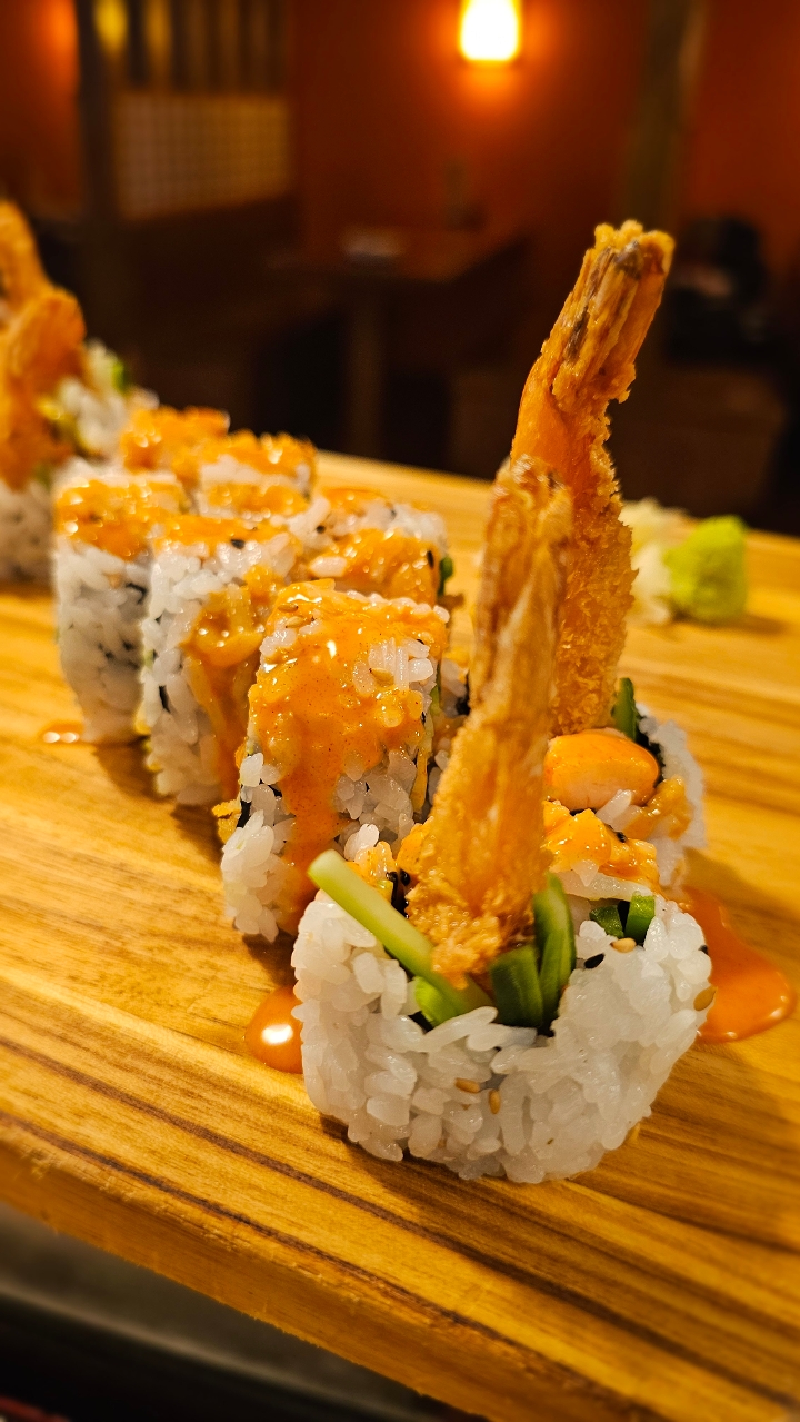 Crab stick, avocado, cucumber, fried shrimp, jalapeño inside. Drizzled with spicy mayo
