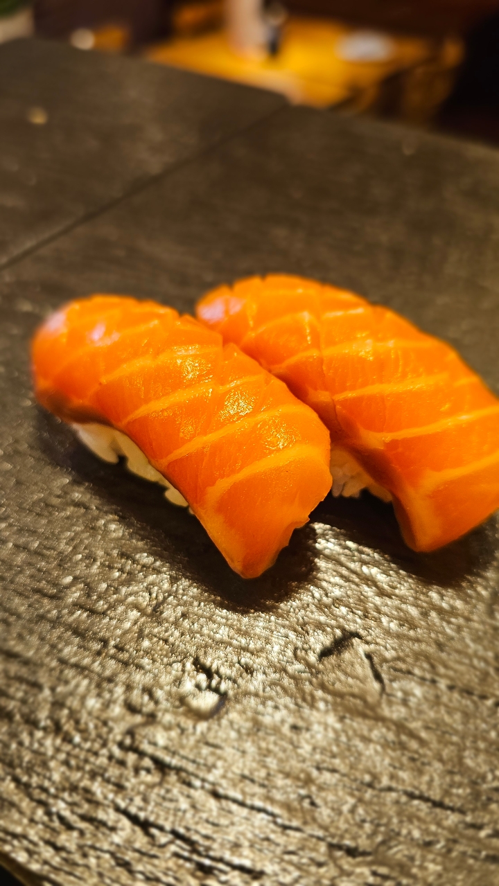 2 pieces salmon nigiri, 3 pieces salmon sashimi spicy salmon roll and salmon avocado roll. Contains raw or undercooked ingredients