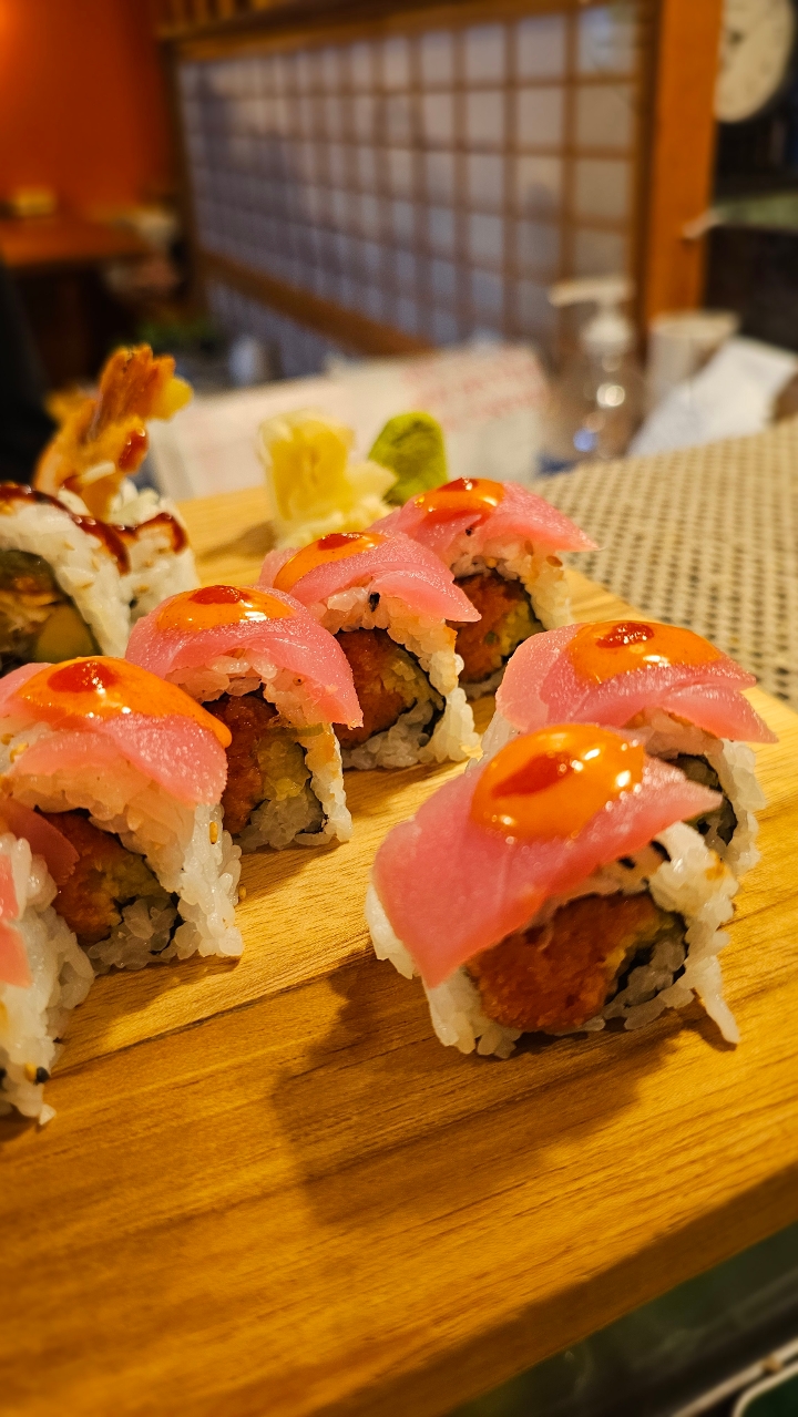 Spicy tuna, avocado, and tempura flake topped with seared white tuna and salmon. Drizzled with eel sauce, and spicy mayo. Sprinkled with red tobiko. Contains raw or undercooked ingredients