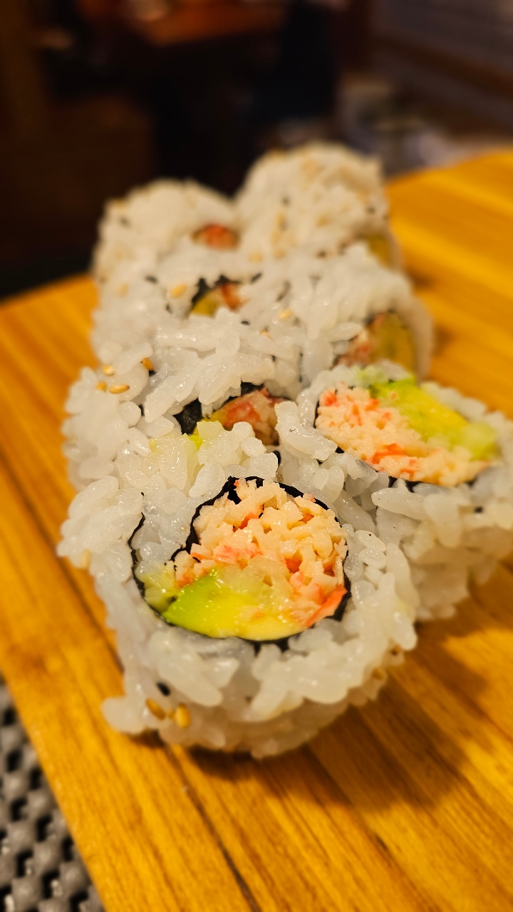 6 pieces of fresh chef selected sashimi + California roll. Contains raw or undercooked ingredients