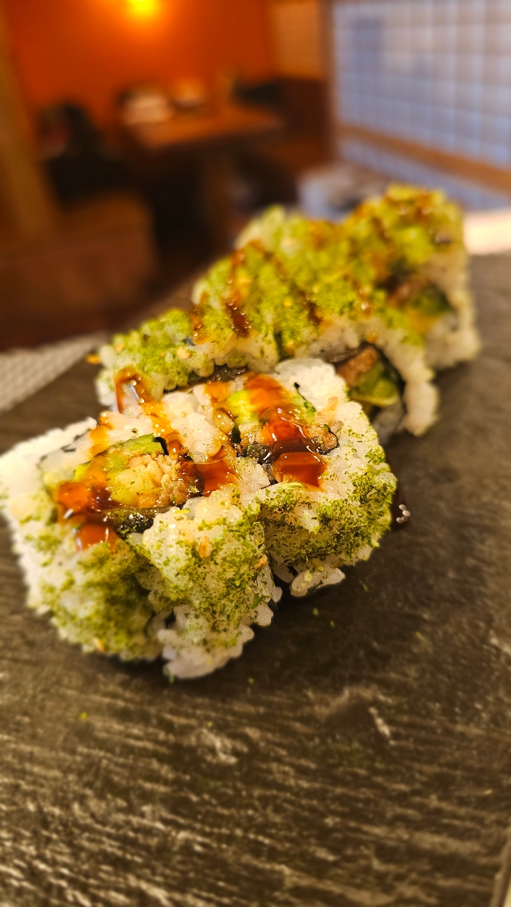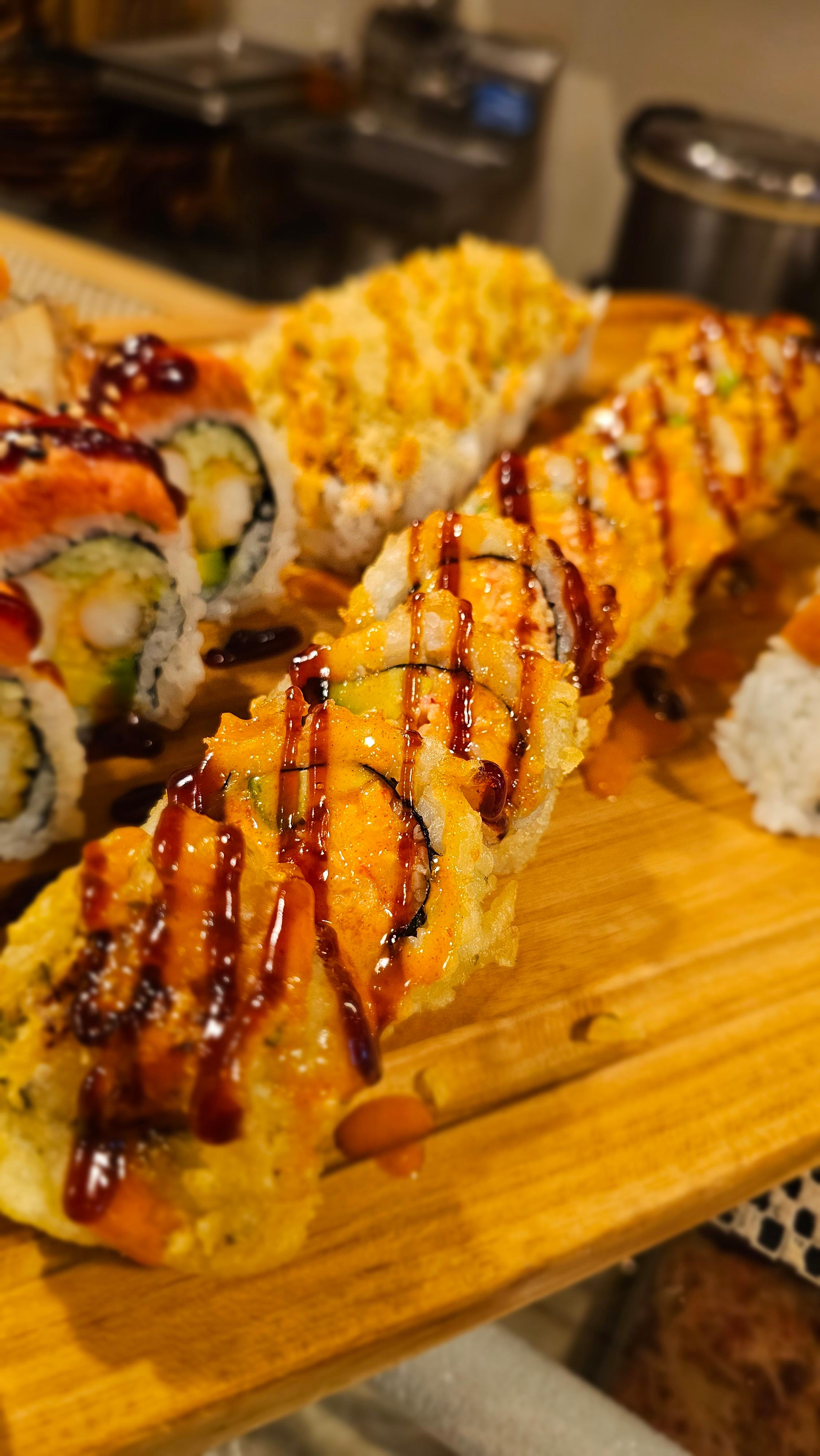 Crab stick, avocado, cream cheese deep-fried and drizzled with eel sauce. Sprinkled with sweet potato crisps