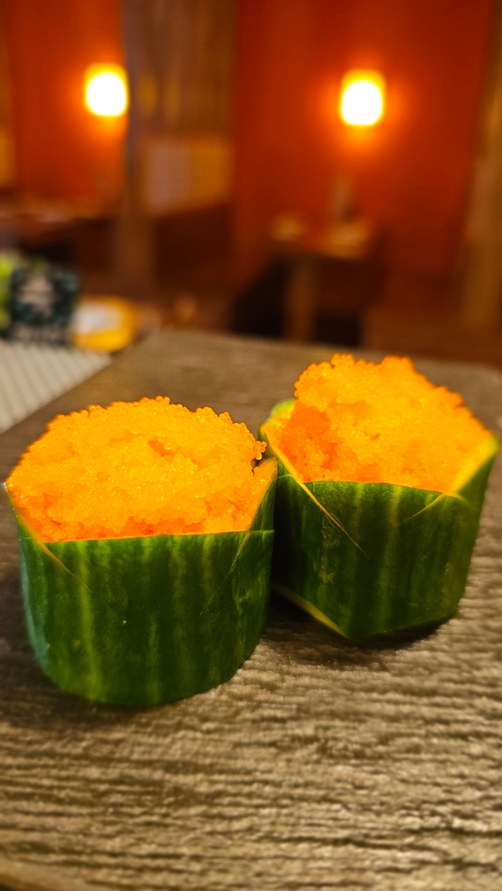 Salmon, tuna, crab stick, avocado, and shredded radish wrapped with cucumber. Served with ponzu sauce. Contains raw or undercooked ingredients