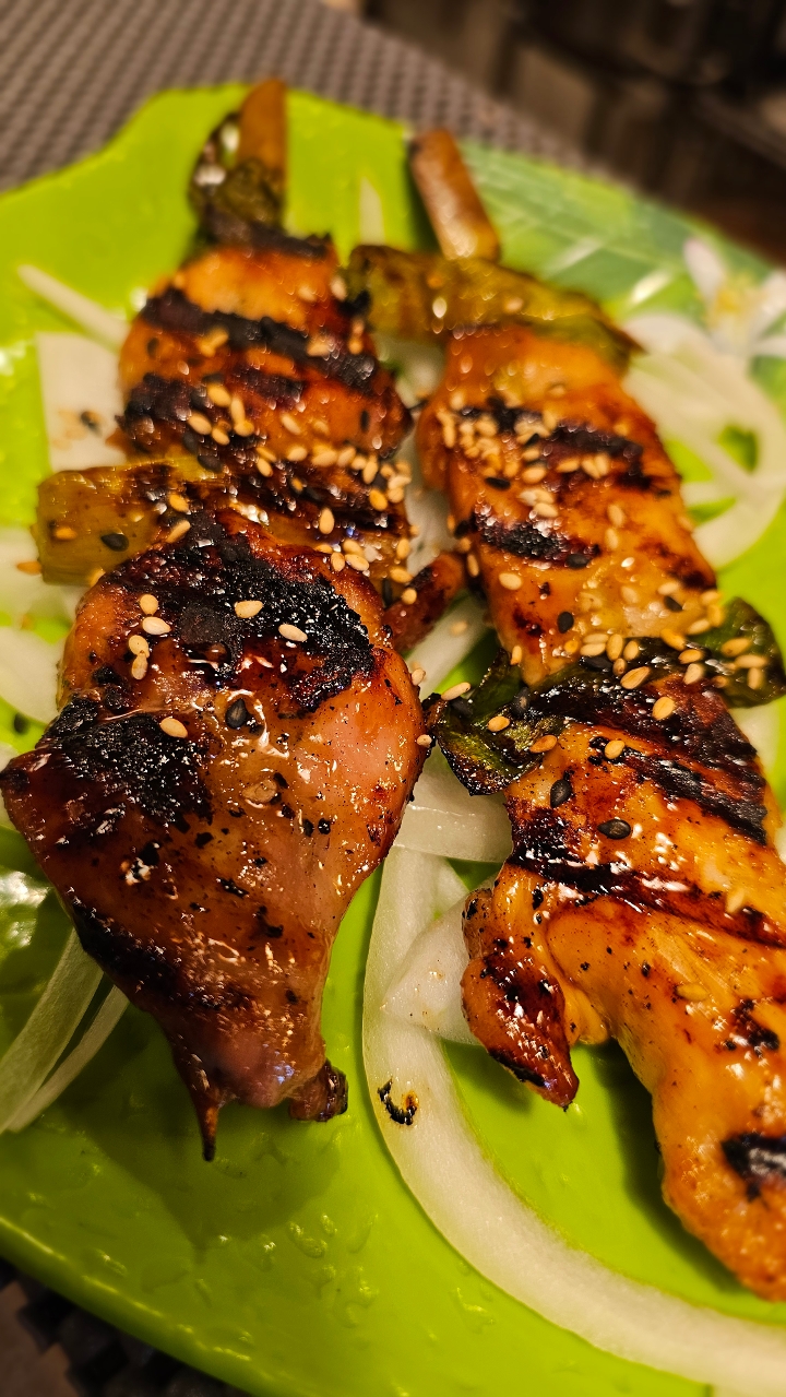 Grilled skewered chicken thigh with teriyaki sauce.