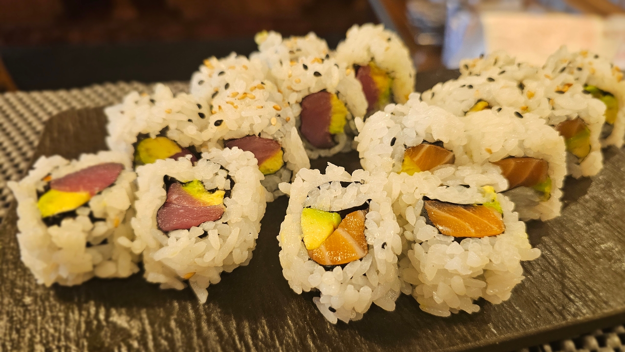 Tuna avocado roll and salmon avocado roll. Contains raw or undercooked ingredients