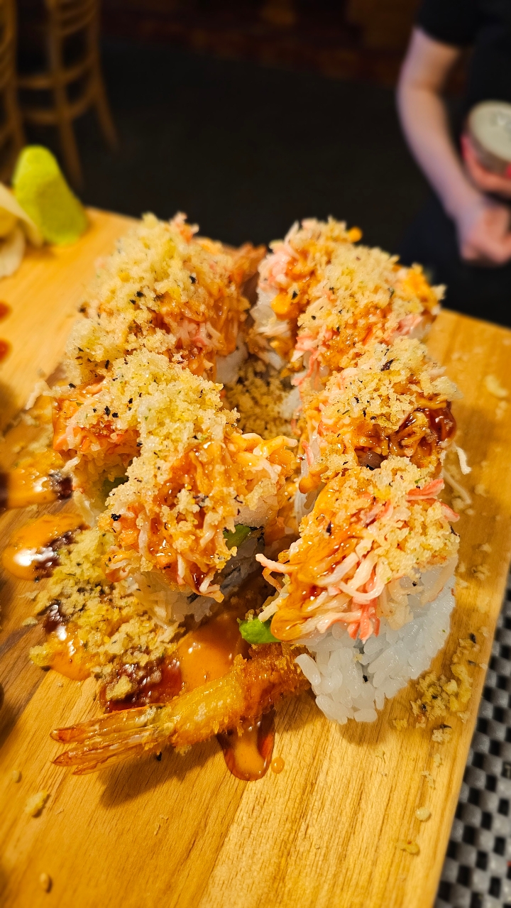 Fried shrimp, crab stick, avocado, cucumber topped with spicy salmon, Colby Jack cheese, and baked. Drizzled with eel sauce