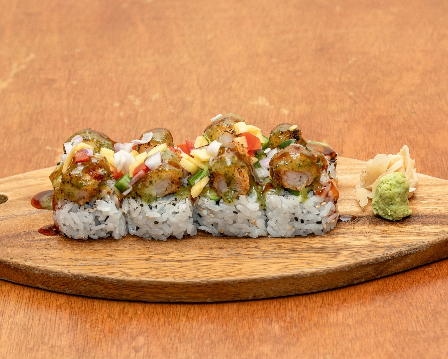 Crab salad, avocado, cucumber, and asparagus inside topped with mango slices. Drizzled with sweet sauce